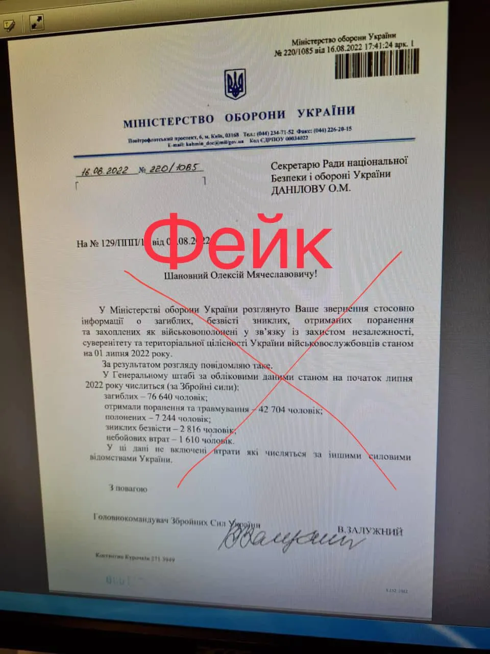 Заметим, что в этом "документе" якобы направляются данные секретарю СНБО Алексею Данилову. В нем сообщается о колоссальных потерях среди личного состава ВСУ. Но мы знаем, что реальные цифры отличаются практически в десять раз.