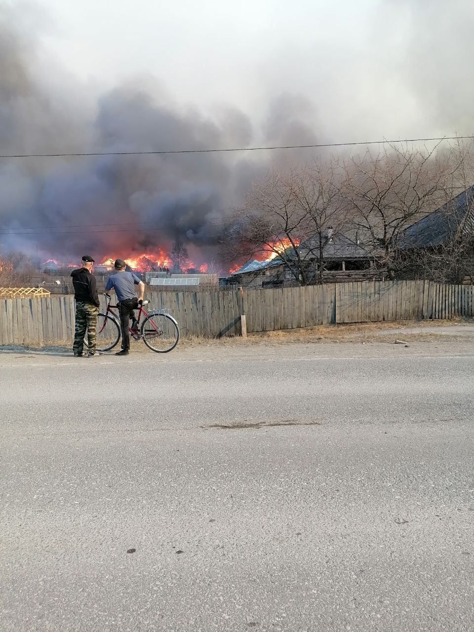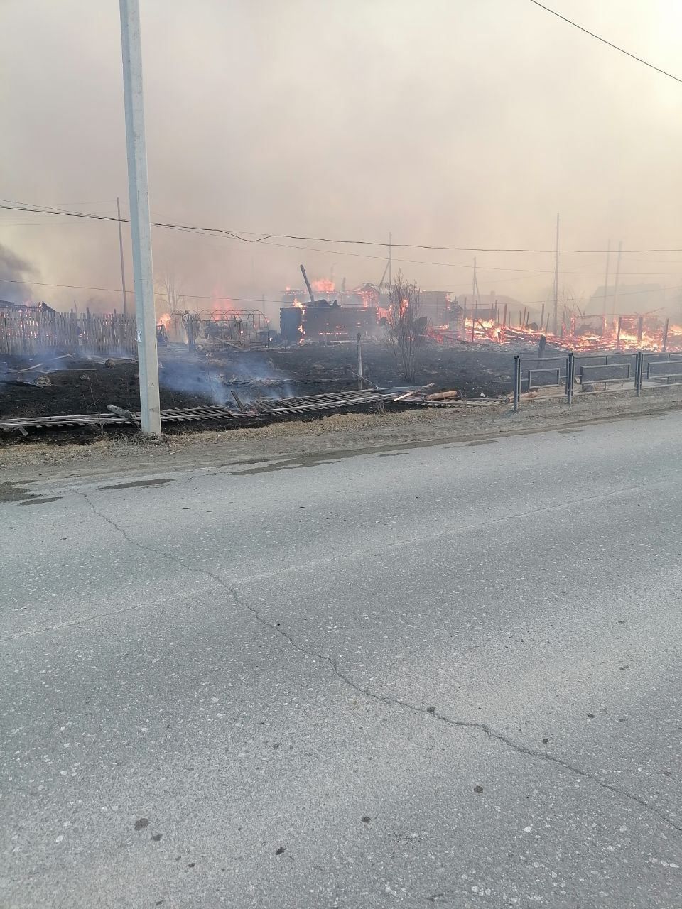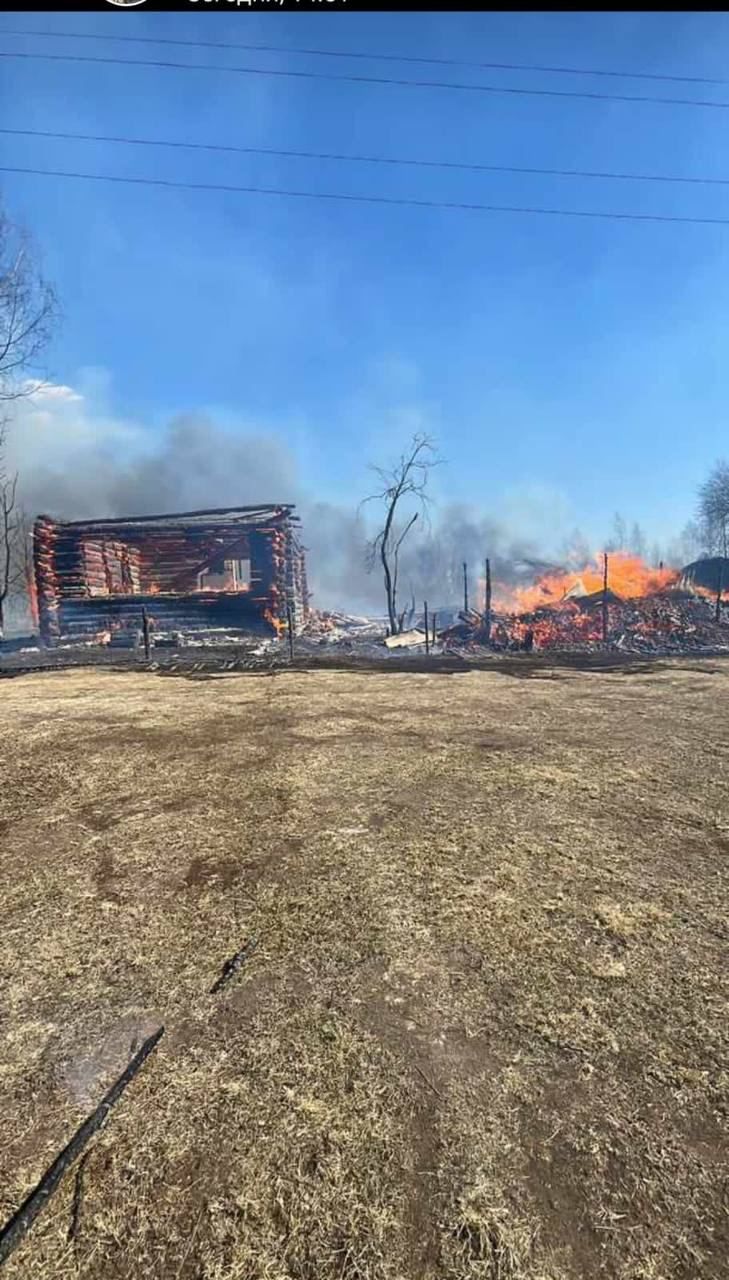 Сообщают, что пожар начался на местной пилораме и из-за сильного ветра быстро перекинулся на соседние здания. Хотя была информация, что возгорание возникло из-за курения травы.