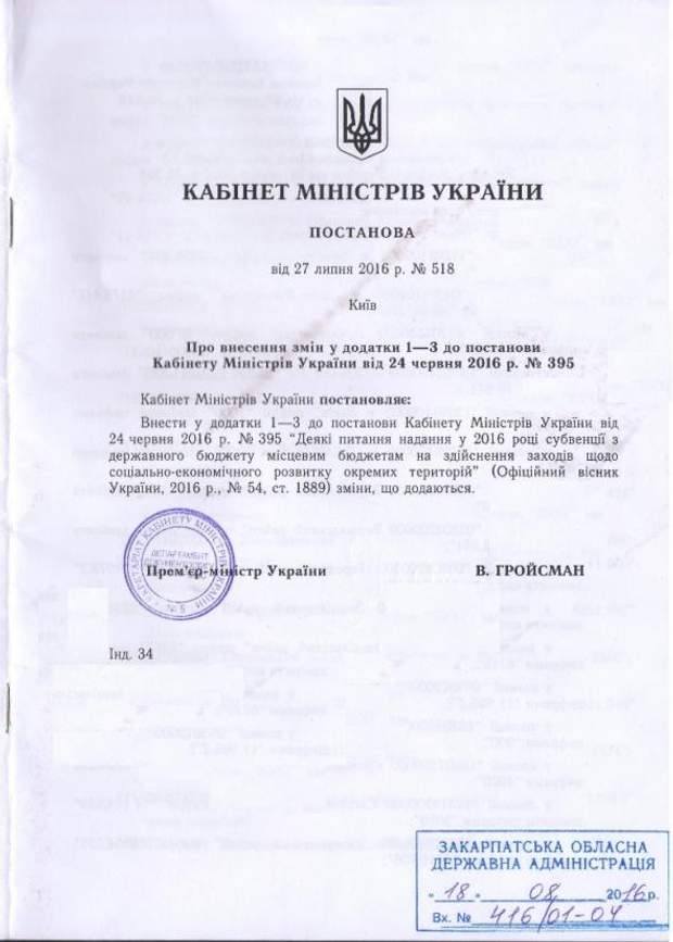 "Постановление Кабинета Министров Украины №518 от 27 июля 2016 года. О предоставлении субвенции из государственного местным бюджетам рябит коммунистическими названиями. И это после введенных в действие законов о декоммунизации", – заявляет чиновник.