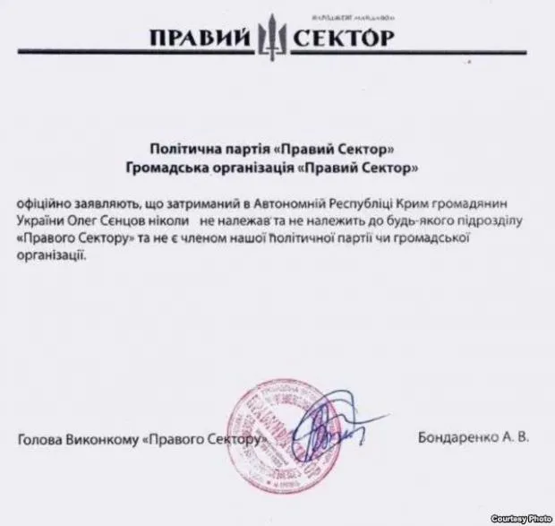Олег Сенцов никогда не принадлежал и не принадлежит к любым структурным подразделениям "Правого сектора", не является членом нашей общественной организации или политической партии,