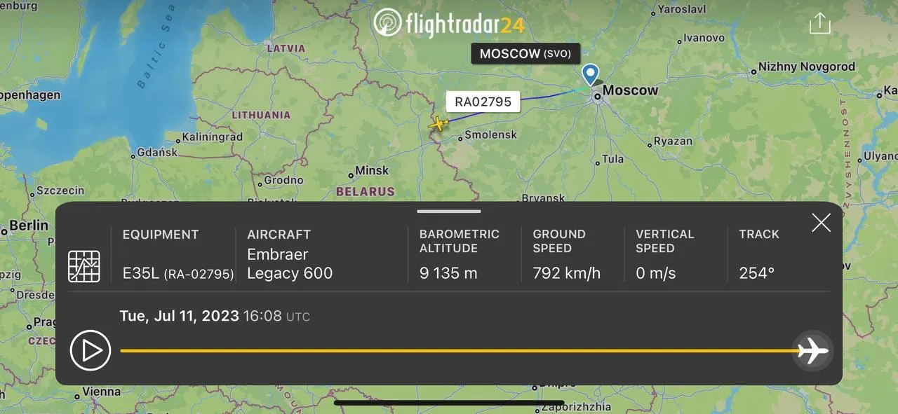 Известно, что в 19:40 бизнес-джет основателя ЧВК "Вагнера" Embraer Legacy 600, чей бортовой номер RA-02795, приземлился 11 июля на военном аэродроме в Мачулищах.