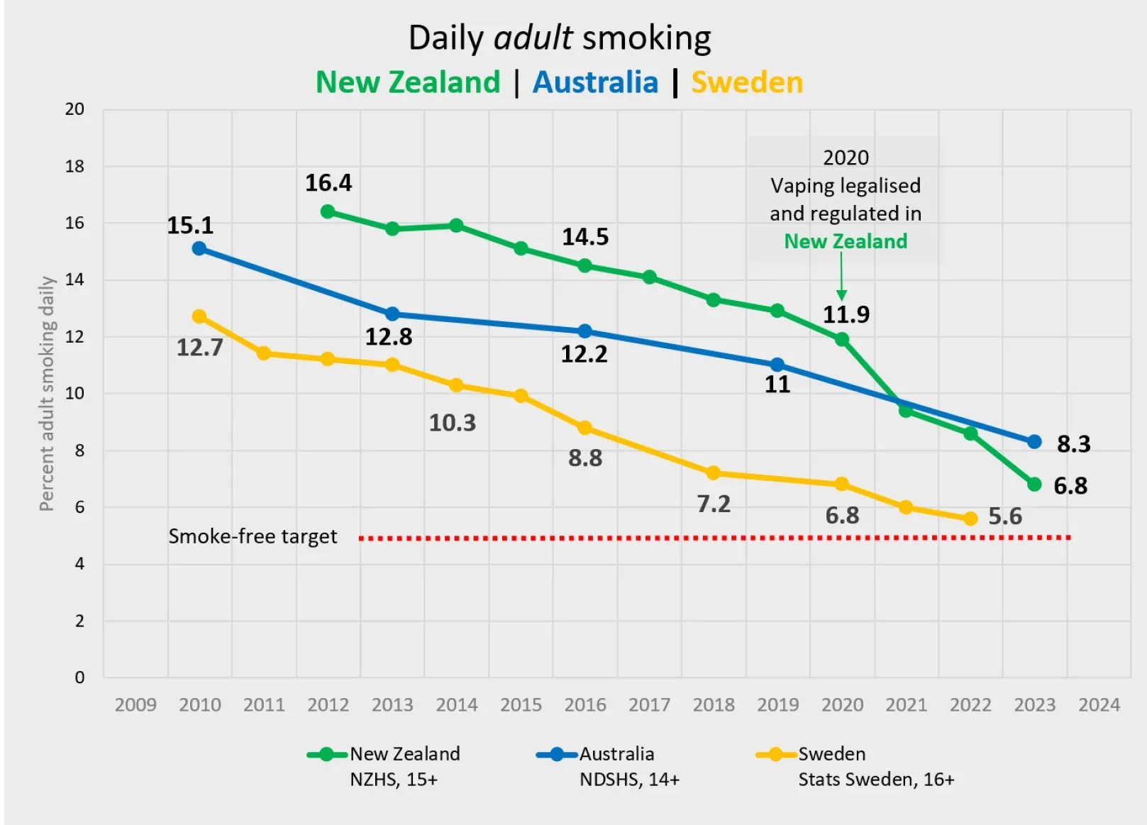 После того как Новая Зеландия легализовала и урегулировала вейпинг в 2020 году, мы стали свидетелями впечатляющего снижения уровня ежедневного курения среди взрослого населения на 43% – с 11,9% в 2020 году до 6,8% в 2023 году. Таким образом, Новая Зеландия находится на пути к достижению своей цели – стать страной, "свободной от табачного дыма" до 2025 года,