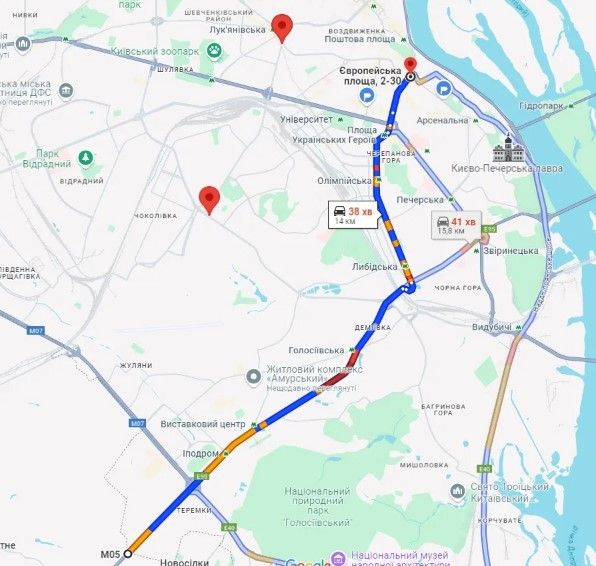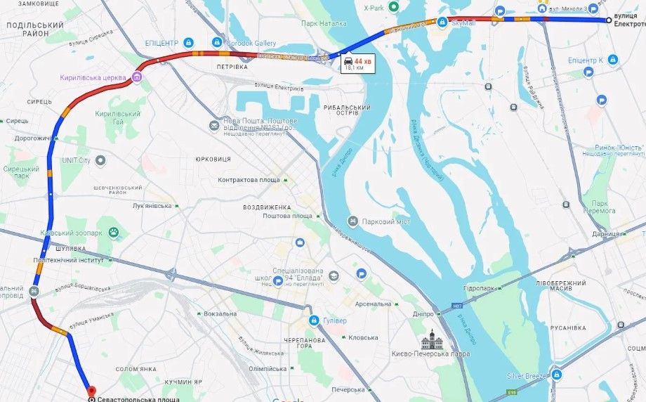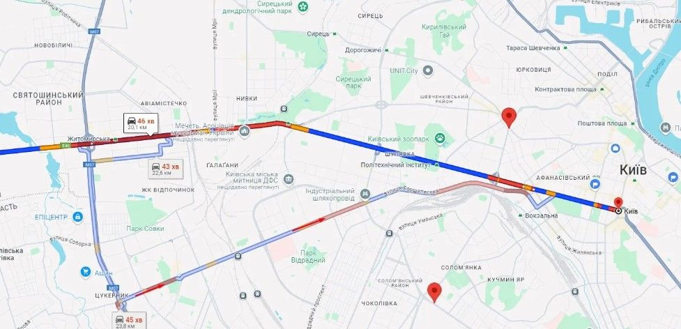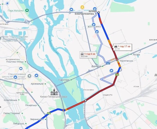 Пробки образовались и на проспектах Романа Шухевича и Степана Бандеры. По данным Google Maps, затруднено движение на улицах Миропольской и Братиславской. Также пробки возникли на участке от проспекта Леонида Каденюка до съезда с моста Патона.