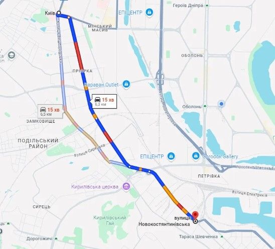 Так, длинная пробка возникла на улице Елены Телиги. Движение затруднено от Кирилловской церкви и до пересечения улиц Елены Телиги и Сырецкой (в сторону станции метро "Дорогожичи").