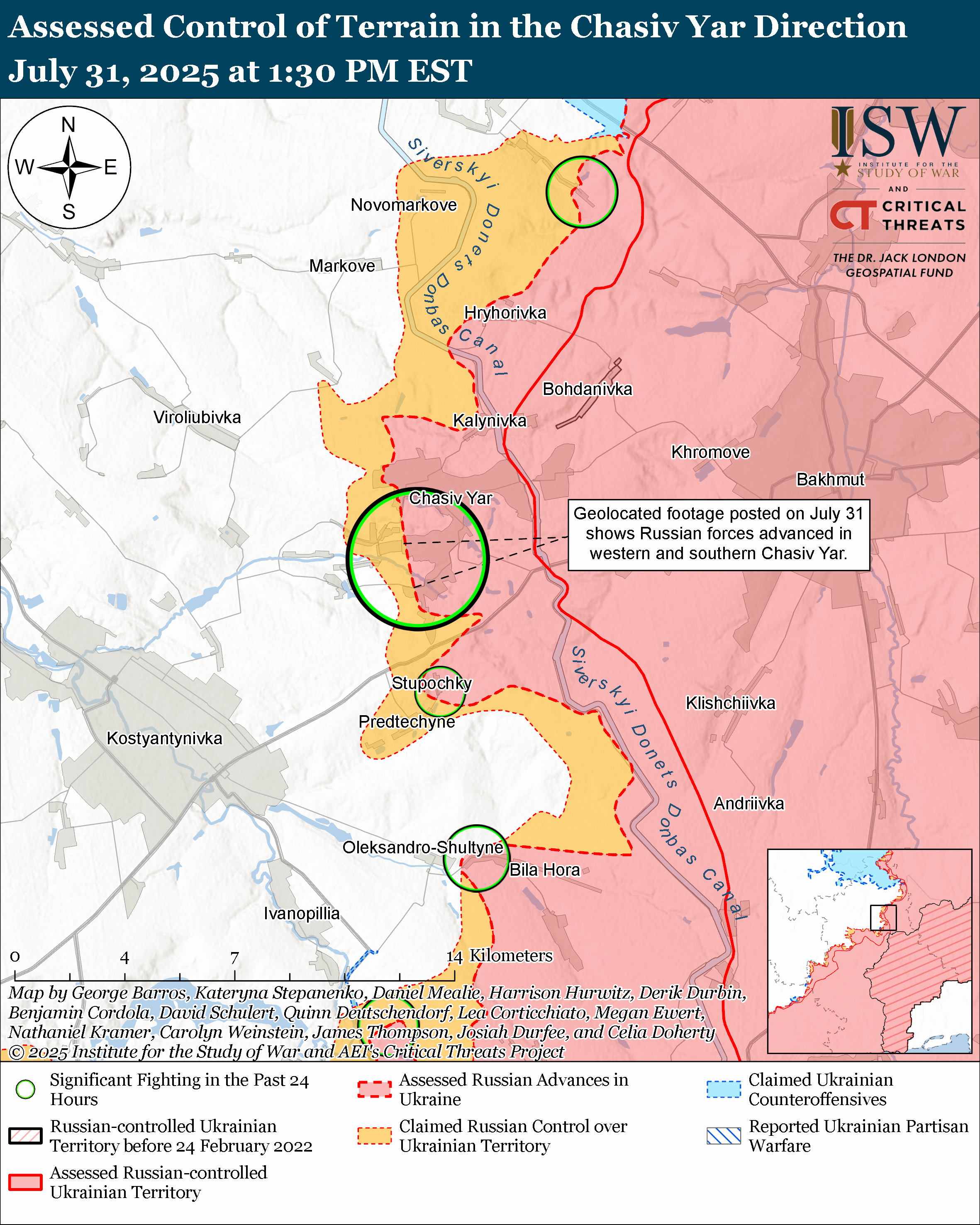 ISW отмечает: геолокационные снимки, опубликованные 31 июля, демонстрируют, что российские войска недавно подняли флаги в западной и южной частях Часова Яра, что свидетельствует о вероятном захвате большей части населенного пункта.