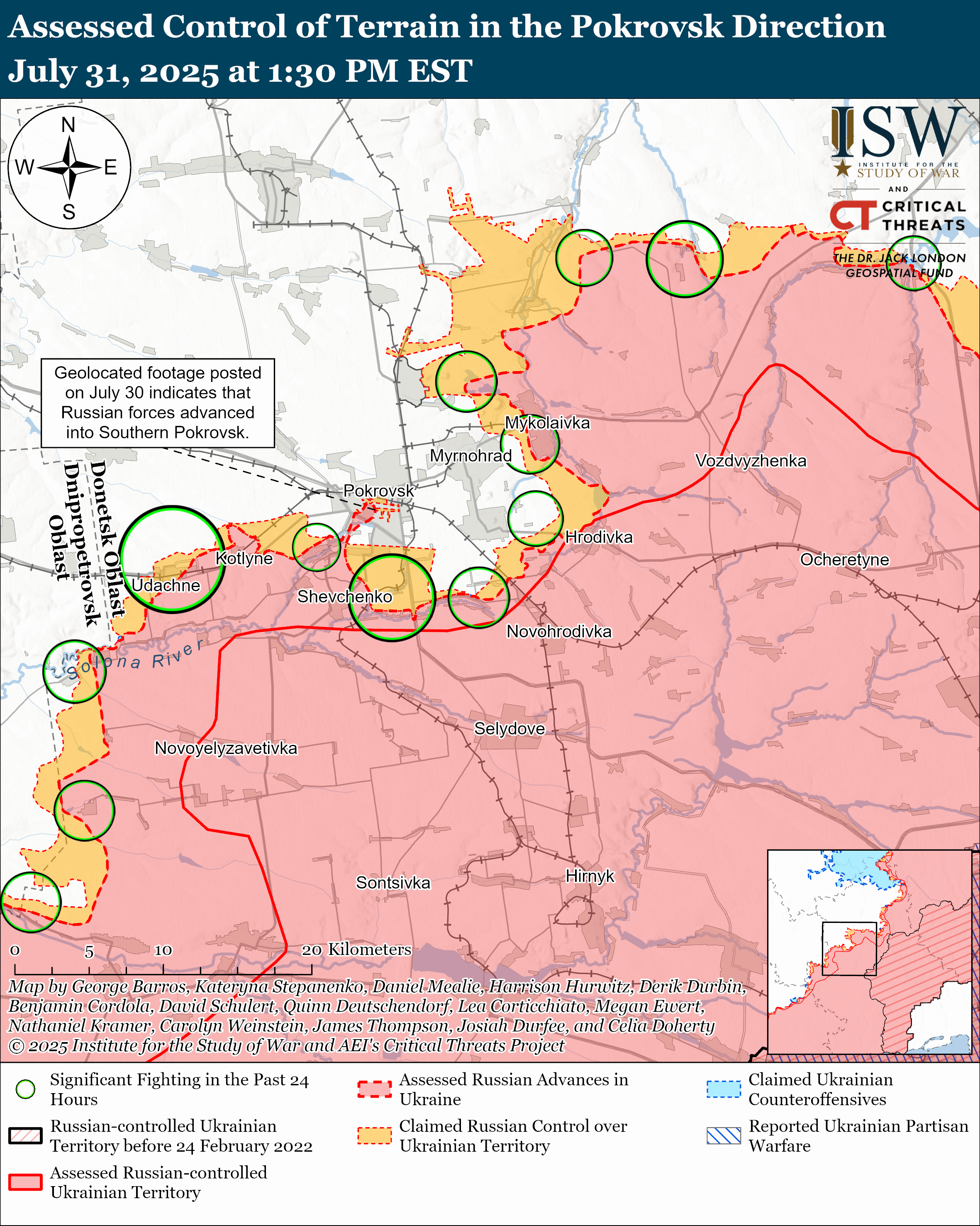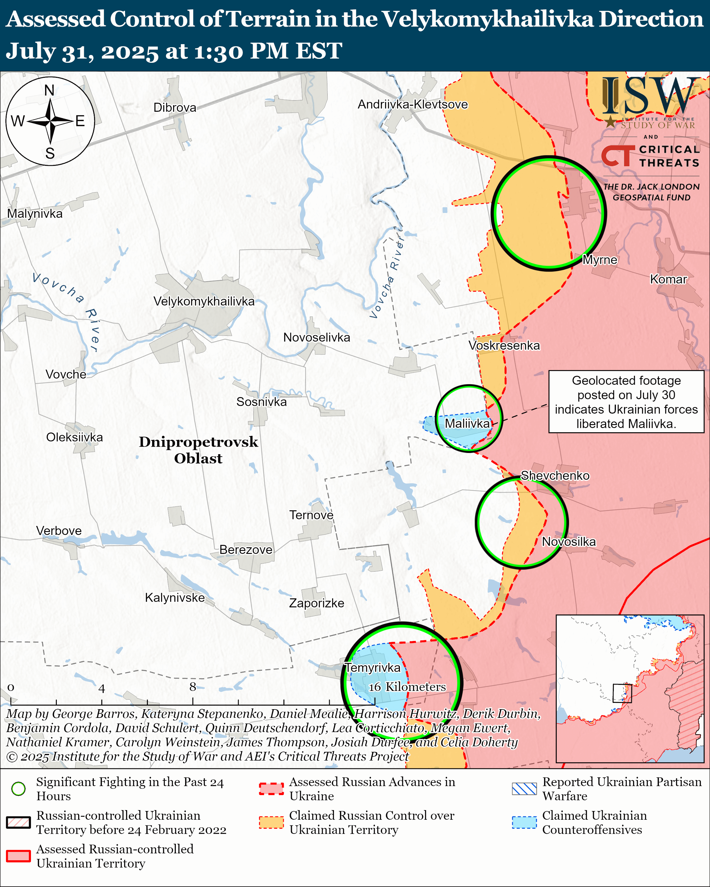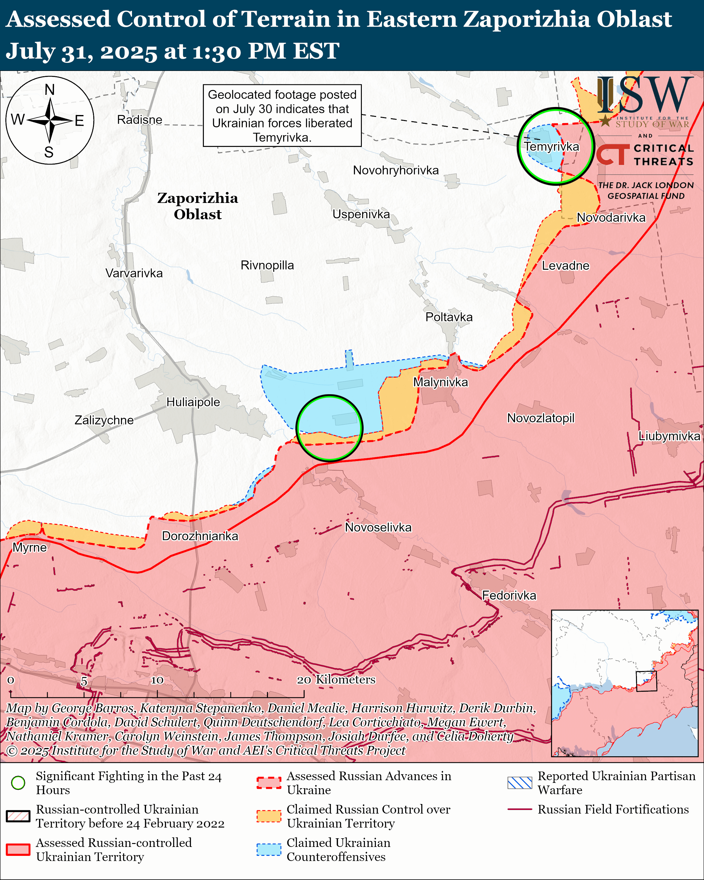 Украинские силы имели успех в восточной части Запорожской области. Геолокационные кадры, опубликованные 31 июля и верифицированные ISW, свидетельствуют, что Силы обороны недавно восстановили контроль над Темировкой (северо-восток от Гуляйполя).