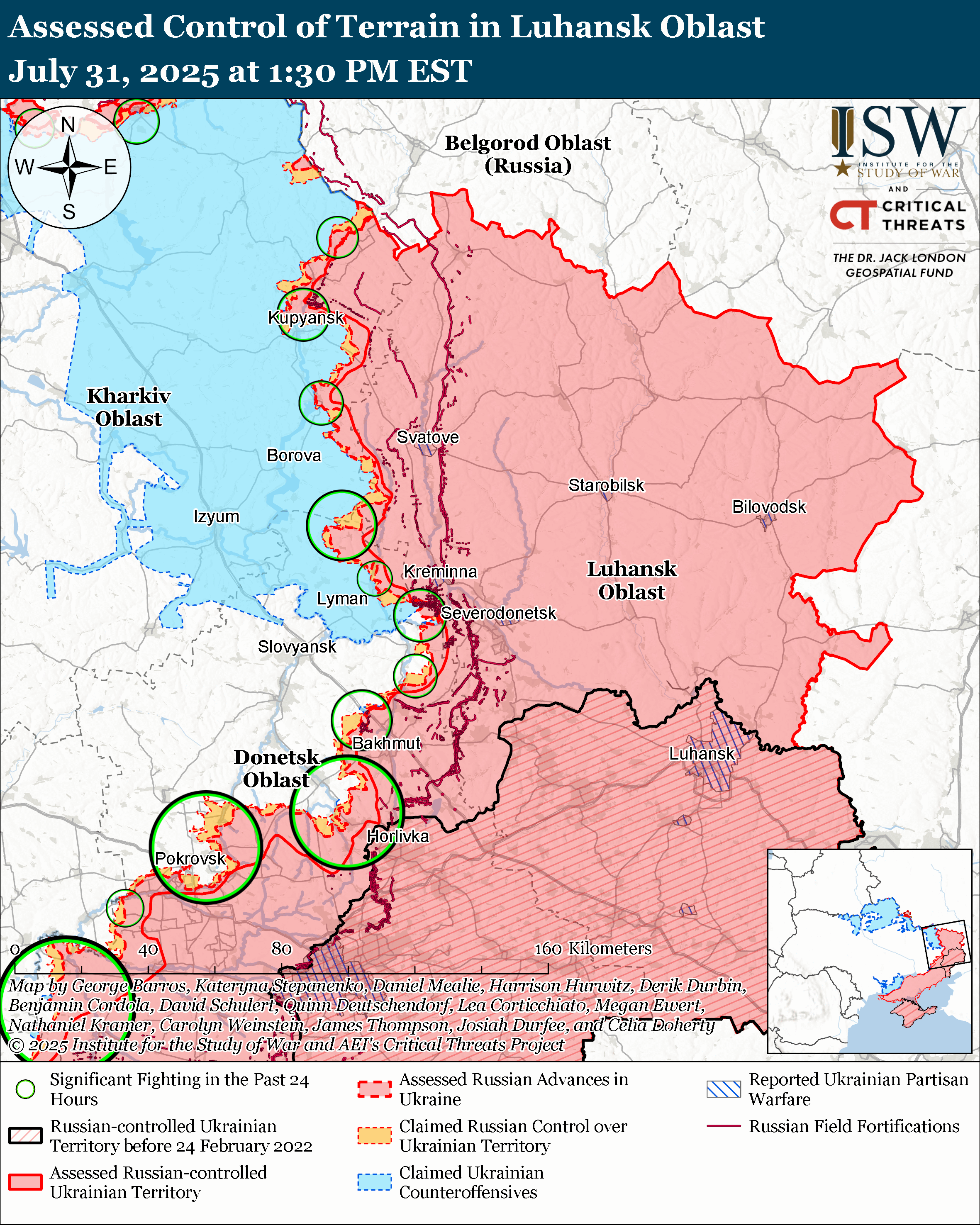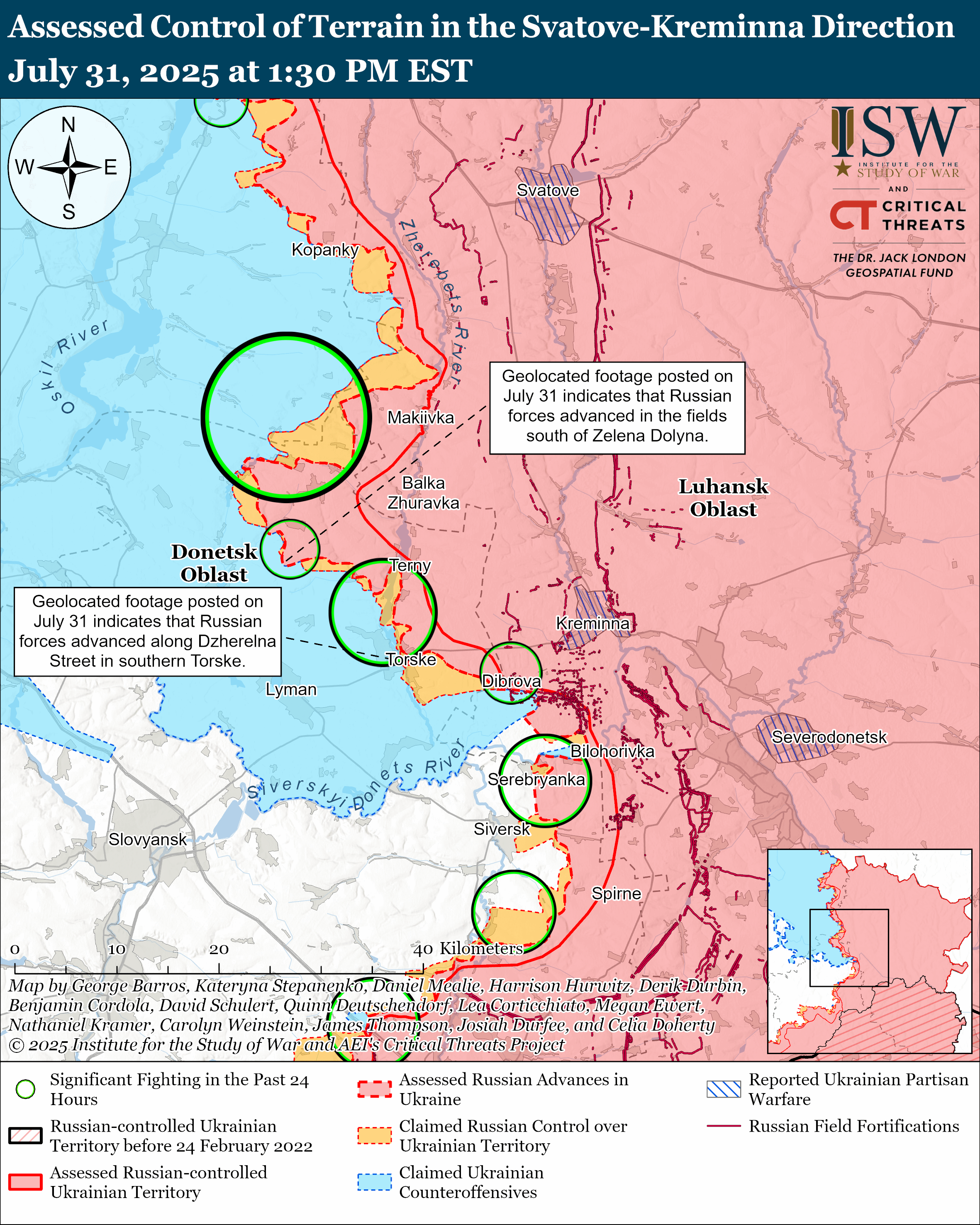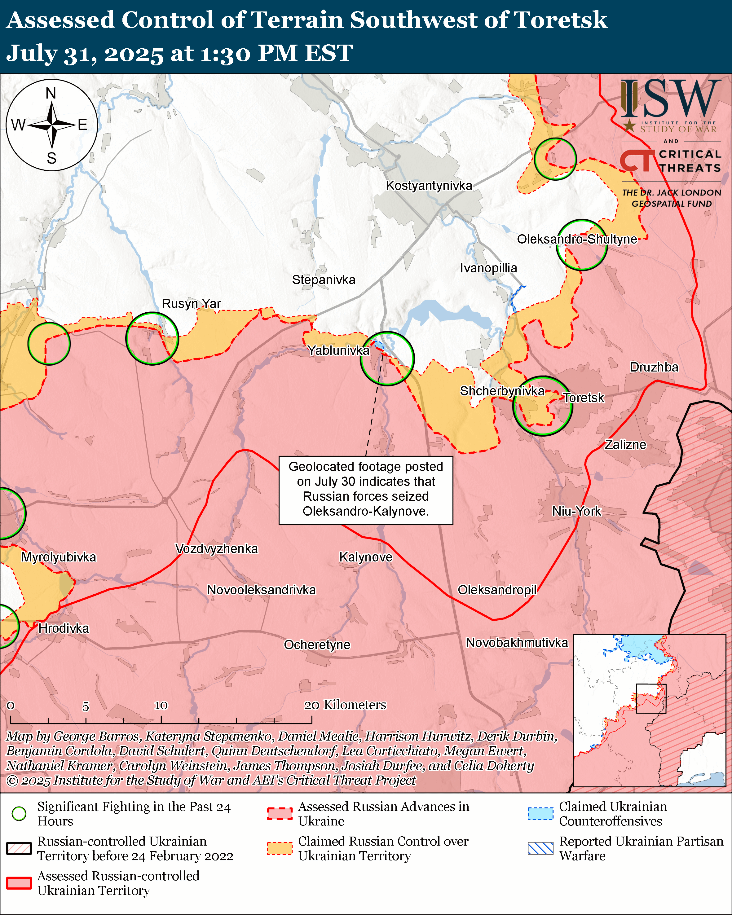 Украинские силы имели успех в восточной части Запорожской области. Геолокационные кадры, опубликованные 31 июля и верифицированные ISW, свидетельствуют, что Силы обороны недавно восстановили контроль над Темировкой (северо-восток от Гуляйполя).