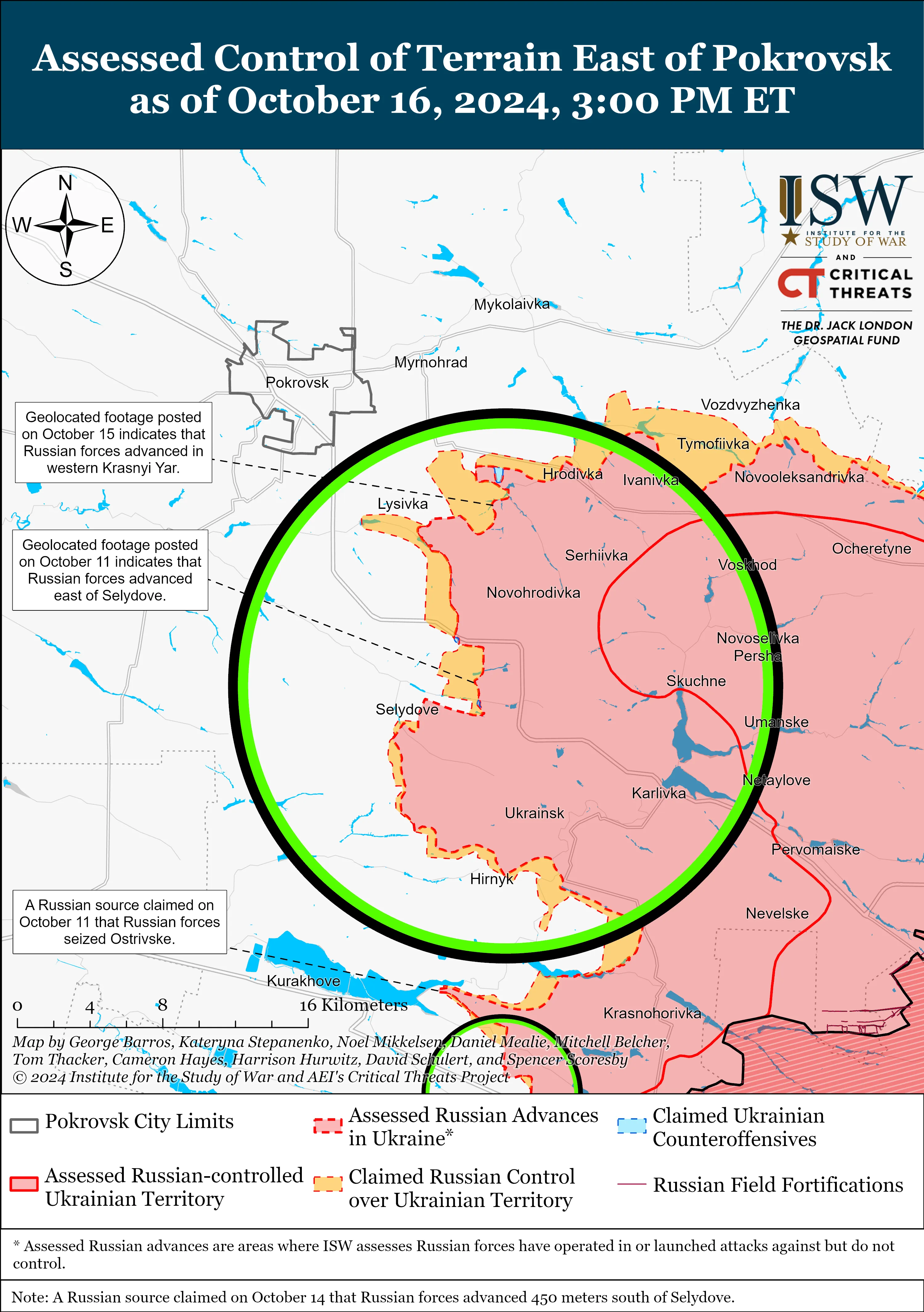 16 октября Министерство обороны России сообщило о захвате Красного Яра, расположенного к юго-востоку от Покровска. Кроме того, российский блогер утверждал, что российские войска продвинулись на юго-запад от Селидово.