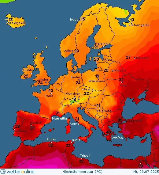 Температурная карта Европы 9 июля / фото Натальи Диденко