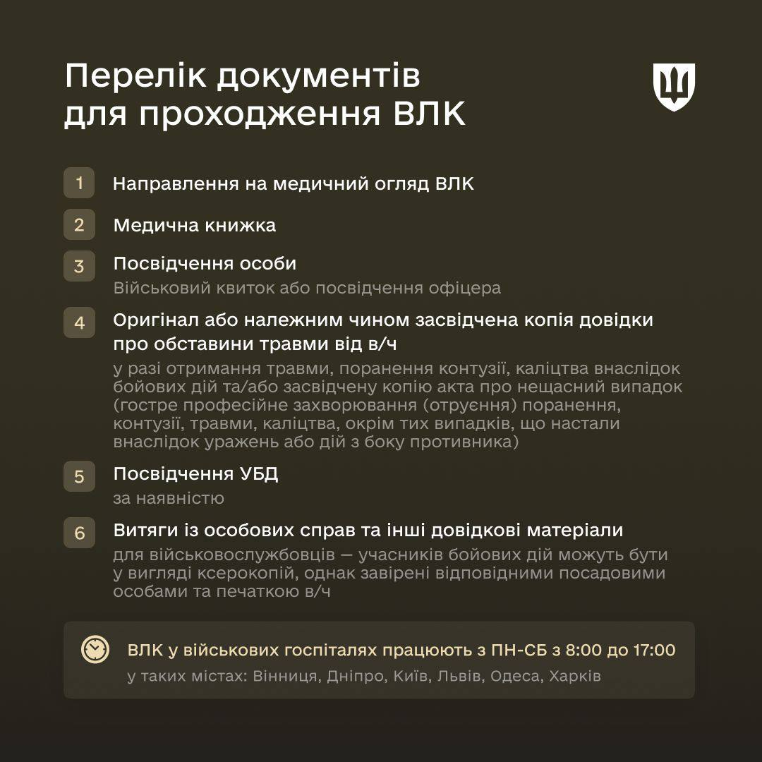 В Минобороны отмечают, что пройти ВВК в поликлиниках военных госпиталей можно в Виннице, Днепре, Киеве, Львове, Одессе и Харькове. Работают они с понедельника по субботу с 8:00 до 17:00.