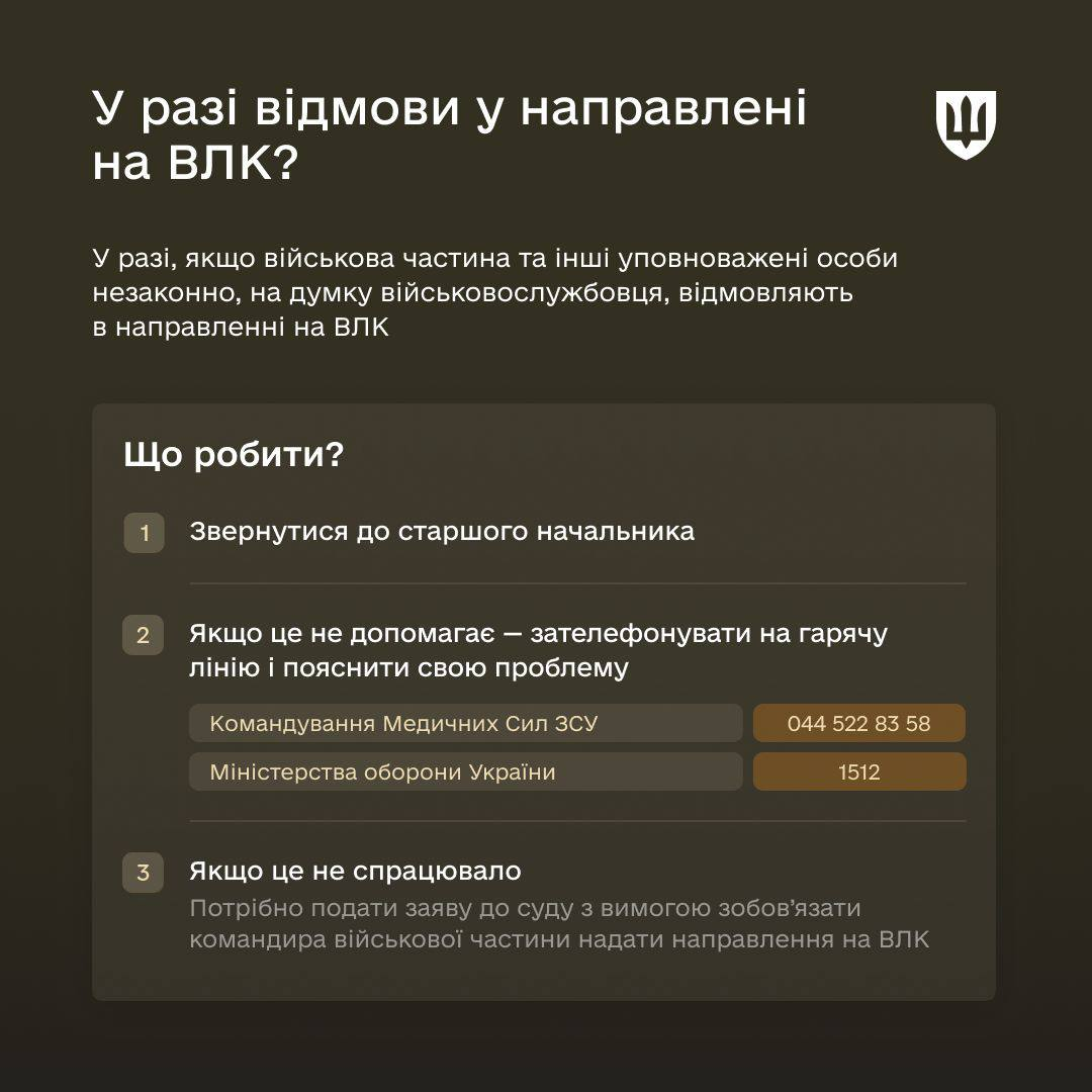 В случае, если военнослужащий получил отказ в направлении на осмотр комиссии, он может обратиться за помощью к своему старшему начальнику или лично позвонить в Командование Медицинских Сил ВСУ по номеру 044 522 83 58.