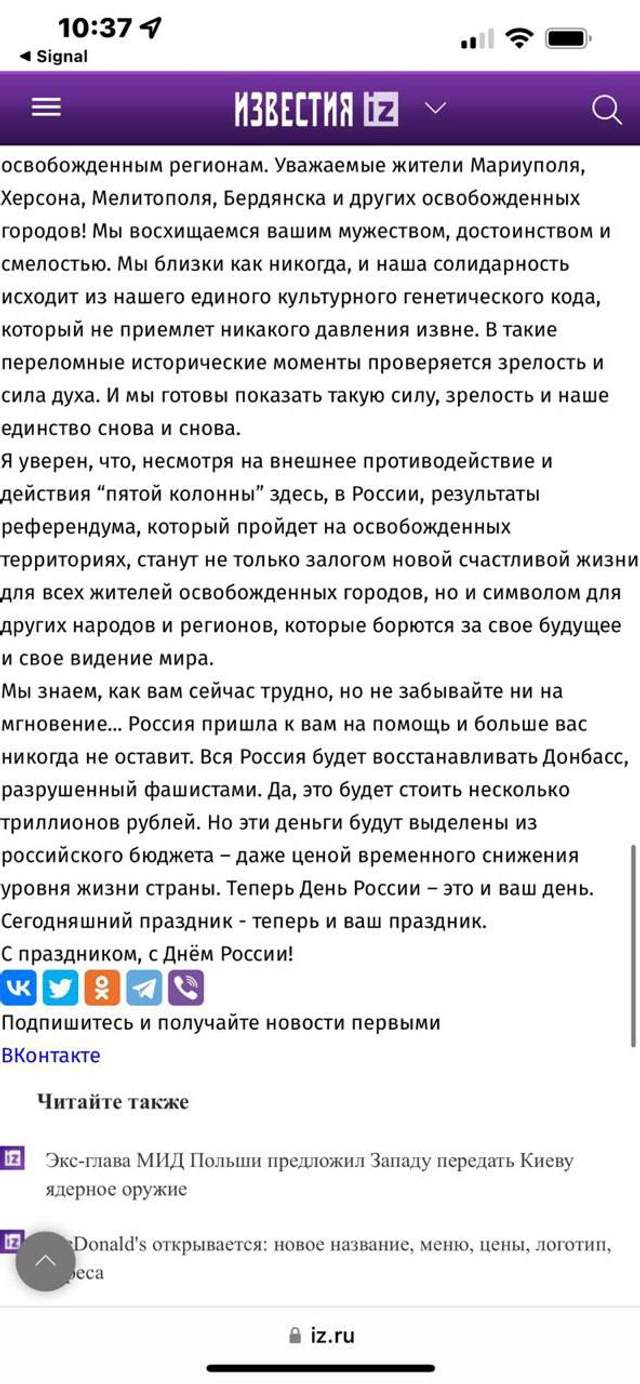 "Сегодня, в этот праздничный день, я хочу обратиться к освобожденным регионам. Уважаемые жители Мариуполя, Херсона, Мелитополя, Бердянска и других освобожденных городов", – цинично заявил так называемый куратор Донбасса.