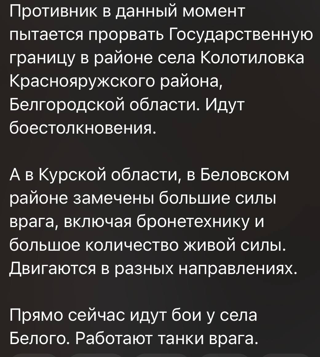 Заметим, что россияне также начали писать о попытке "прорыва" в Белгородской области. Они заявляют о якобы боевых столкновениях в районе села Колотиловка Краснояружского района.