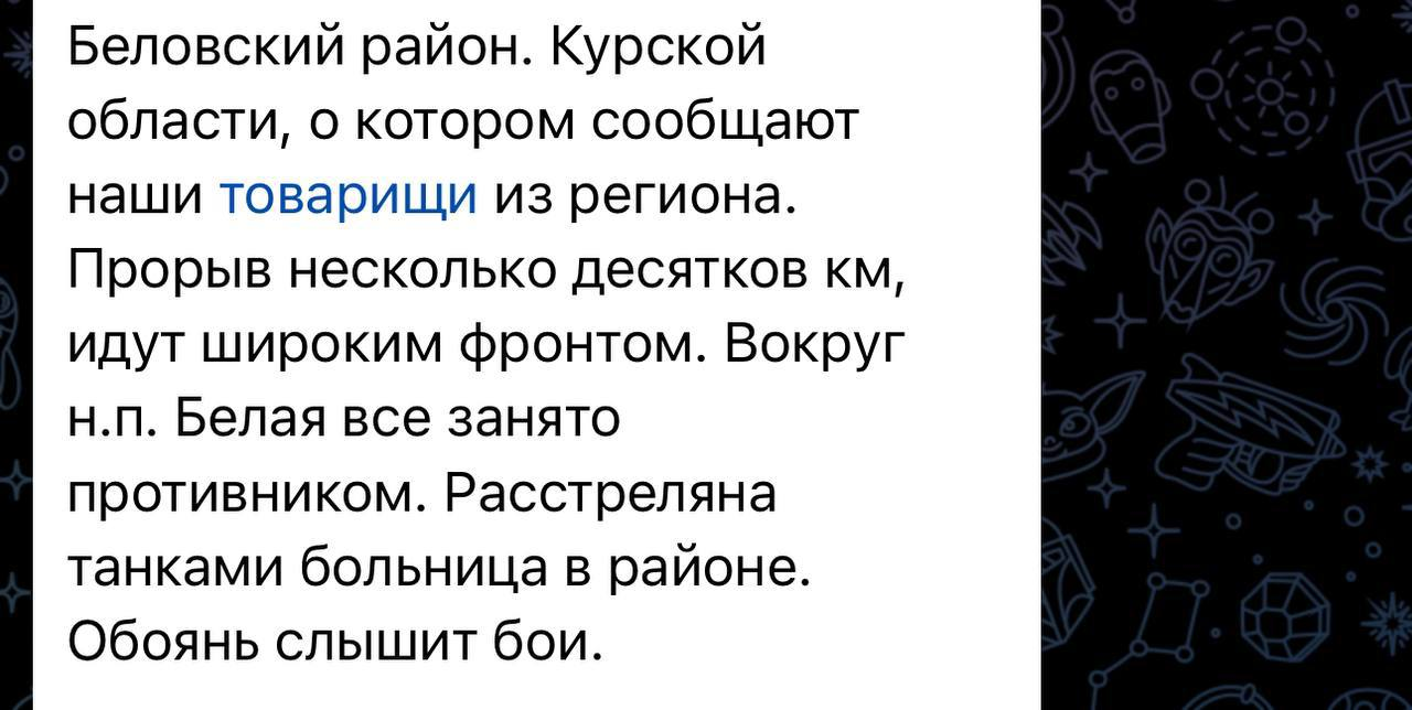Z-каналы начали активно писать о том, что ВСУ якобы вошли в Беловский район Курской области. Россияне заявляют о боях вблизи села Белое. Оккупанты пишут о том, что в Беловский район с разных направлений едут танки и большое количество техники.