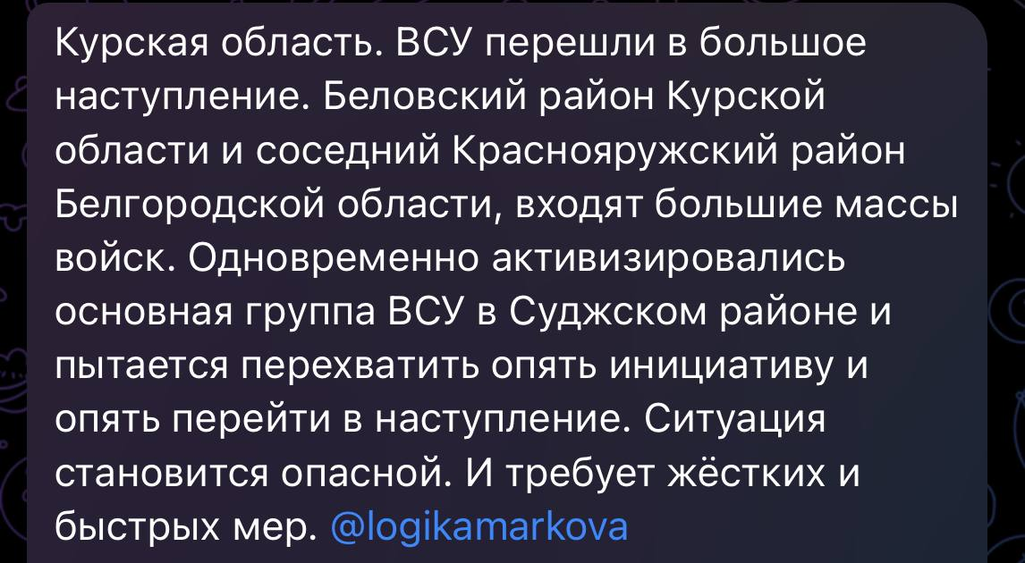 Он также прокомментировал ситуацию в Курске. По его словам, ситуация в городе находится под контролем и никакой паники в городе якобы нет.