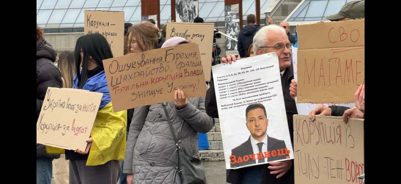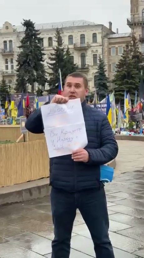 Народ Украины, пусть пока в количестве 100 человек, но вышел, видя весь этот позор в государственной власти, которая продолжается не то что не один месяц – не один год. Они используют закон как произвол, власть как способ обогащения и мародерства у своего же народа, у своих же ВСУ, – озвучил один из митингующих.