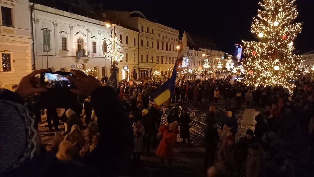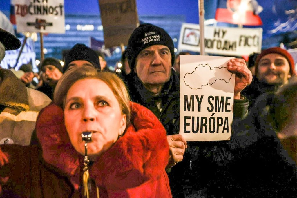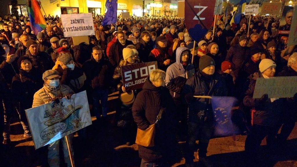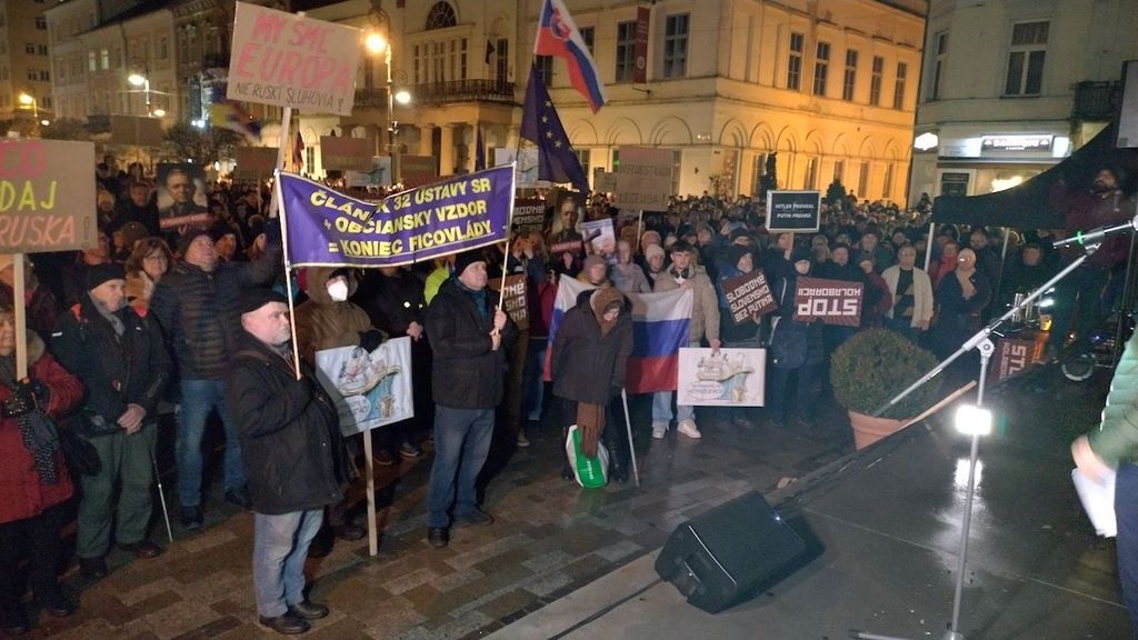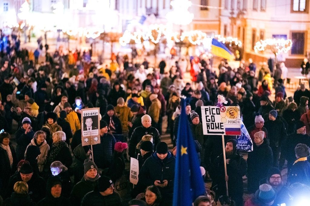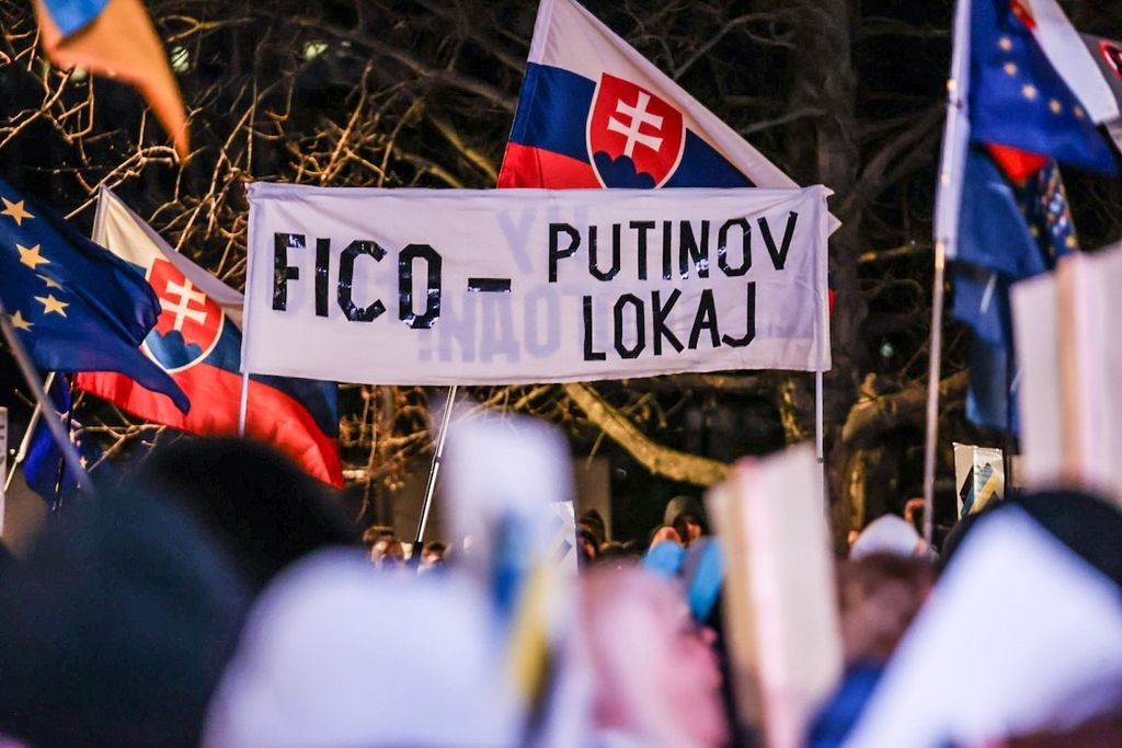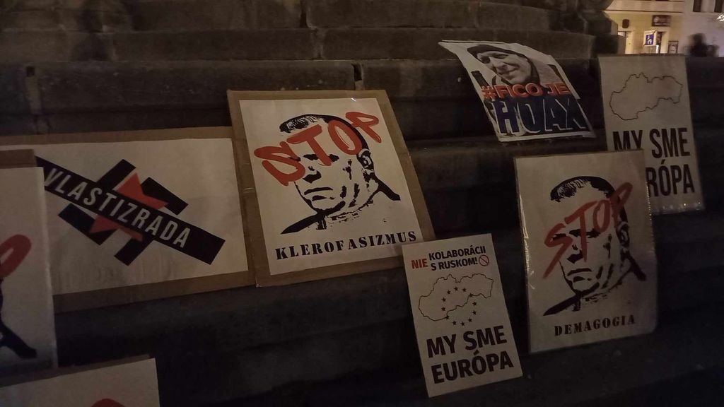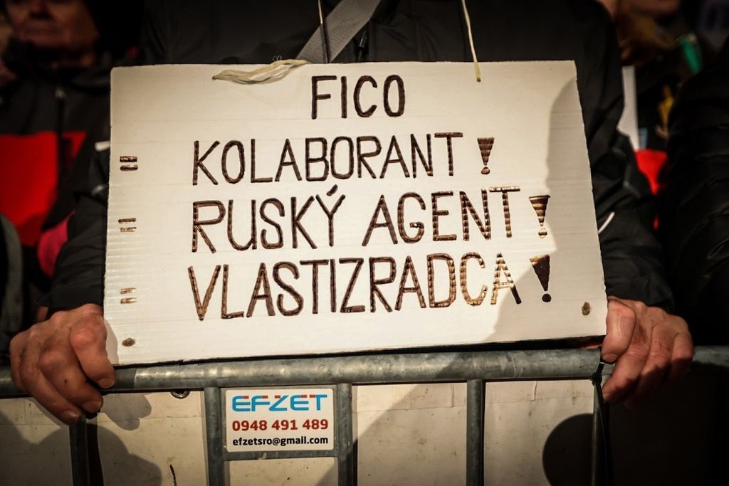 Кроме того, в городах держали плакаты с критикой политики Роберта Фицо, в частности его сближение с Россией и диктатором Владимиром Путиным.
