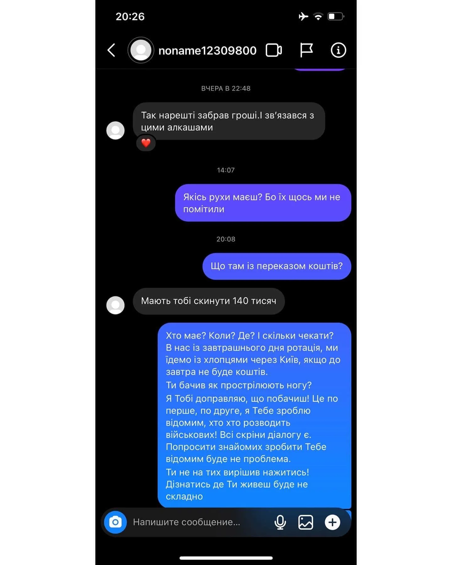 Хемич Виталий Игоревич решил нажиться на военных на сумму 140 000 гривен. История началась с того, что мы собрали на авто и дрон. И начали искать, как быстро все приобрести, и появился Виталик, который начал рассказывать и сбрасывать видео, что у него все есть и что он все это нам может доставить на передовую за 3/5 дней. Нам как раз это время и подходило,