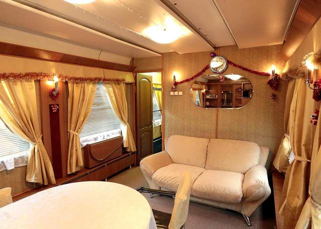 Вагон-салон является настоящим отелем на колесах, который оборудован кухней, большим залом и просторным спальным купе. Кухня оборудована холодильником, микроволновой печью и электроплитой. Большой зал оборудован мягким уголком, компьютером, аудио- и видеотехникой. В спальном купе есть кровать, письменный стол, шкаф, кондиционер, ванная комната. Количество спальных мест составляет от 5 до 11,