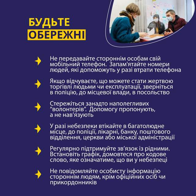 - Если вы чувствуете, что можете стать жертвой торговли людьми или эксплуатации, обратитесь в полицию, в местные власти, в посольство.