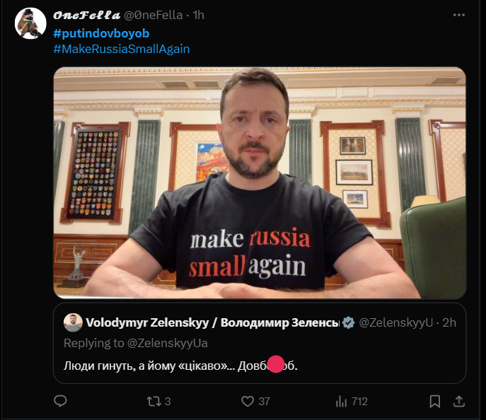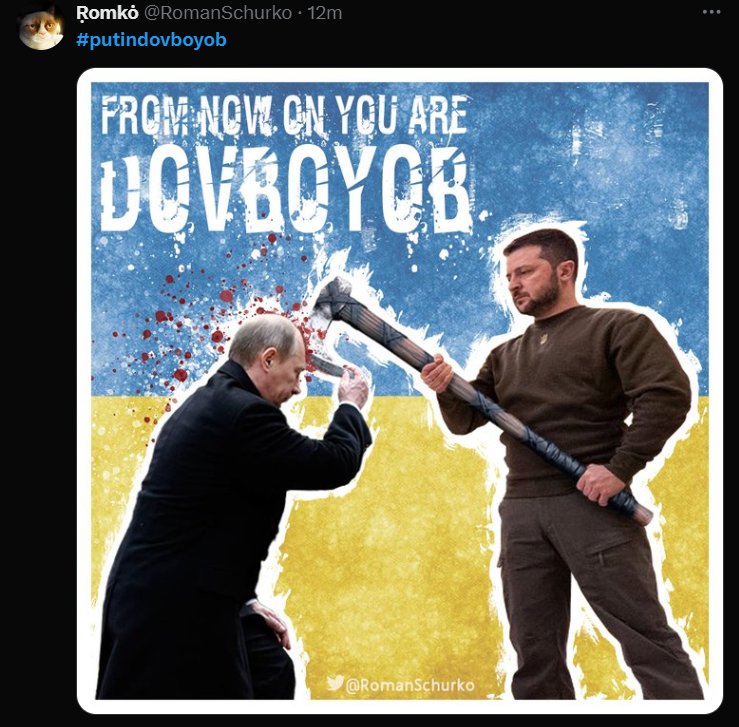 Сразу после этого украинцы запустили новый флешмоб. Все, кто согласны с таким мнением президента, пишут в комментариях к его публикации или на собственных страницах хэштег #putindovboyob. Пользователи как просто присоединяются, так и подкрепляют посты мемами.