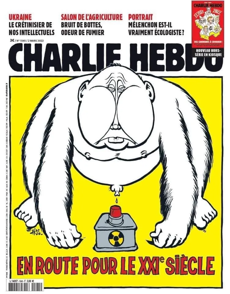 Обложка французского журнала Charlie Hebdo на этой странице: Путин – обезьяна, мочащаяся на красную ядерную кнопку,