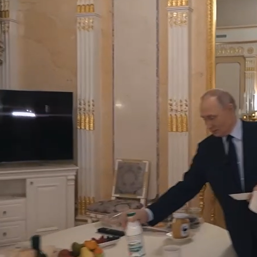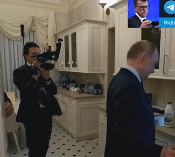 В шестиминутном фрагменте щедро используется один из распространенных приемов для очеловечивания героя сюжета, в котором тот предлагает съемочной группе чем-то угоститься и занимается на кухне привычными зрителю делами. Так, Путин кормит Зарубина конфетами и поит кефиром.