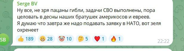 "Ну все, не зря ребята гибли, задачи сво выполнены, время целовать в ясна братиков-америкосов и евреев. Я думаю, что завтра уже надо подавать заявку в НАТО", – пишет еще один россиянин.