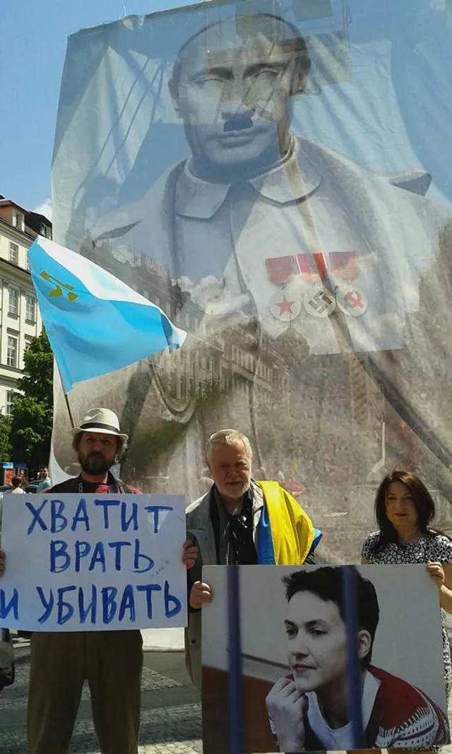 В акции протеста приняли участие более 50 человек. Активисты флагами Украины, ЕС, США и НАТО скандировали: "Домой, оккупанты!", "Чемодан, вокзал, Россия!" и "Свободу крымским татарам!". Также на площади был установлен огромный вертикальный баннер с фотомонтажом, изображающим Владимира Путина в образе Гитлера и Сталина.