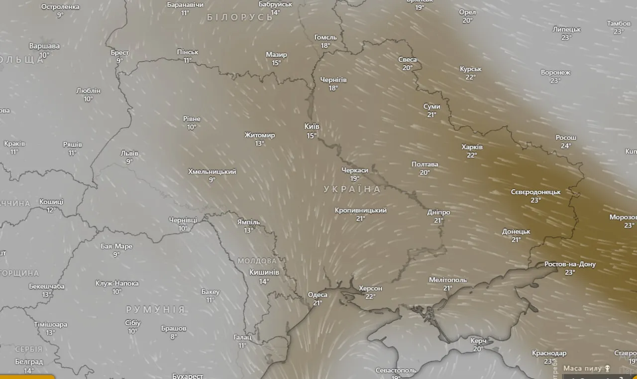 В восточных, северных, Полтавской и Днепропетровской областях ожидается наибольшая концентрация пылевых частиц.