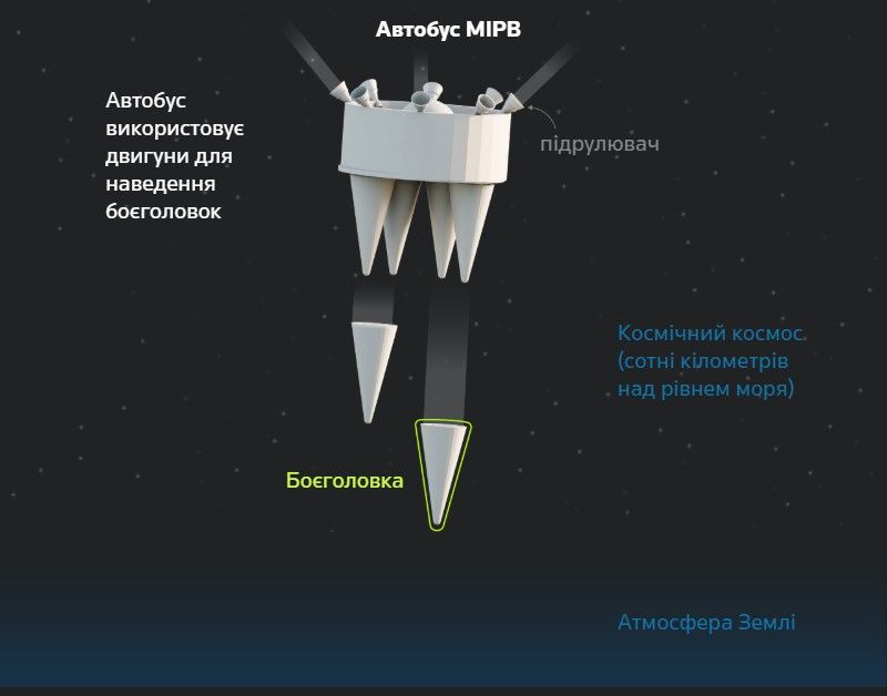 - Непосредственно перед тем, как выпустить боеголовки, MIRV ориентируется с помощью бортовых систем наведения, чтобы она могла направить каждую из них на определенную цель.