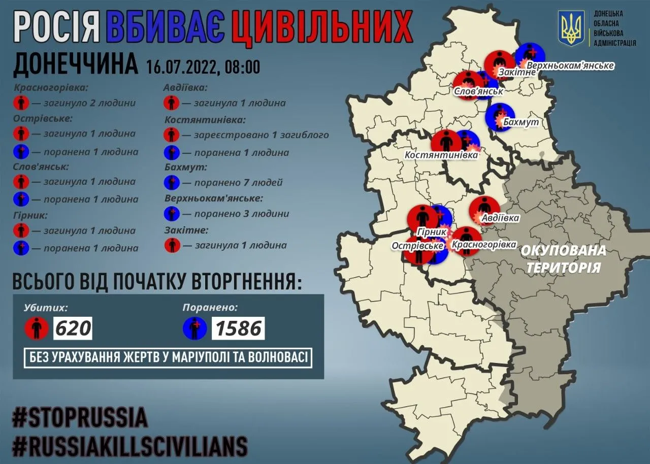 Враг не только уничтожает инфраструктуру городов. Он еще и уносит жизни жителей Донецкой области. Так, в течение 15 июля оккупанты убили семерых человек: