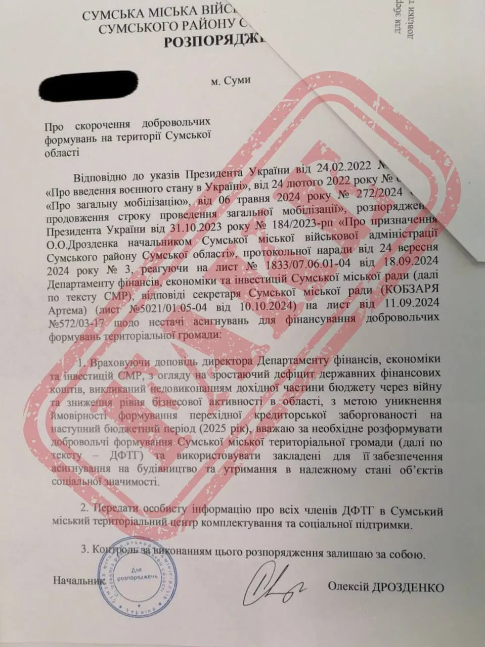 Так, в сети распространяется фейковое распоряжение, якобы подписанное Дрозденко, о расформировании добровольческих формирований Сумской территориальной громады (ДФТГ) из-за "недостатка финансирования". В "документе" также указано, что информацию о добровольцах якобы передадут в ТЦК и СП.