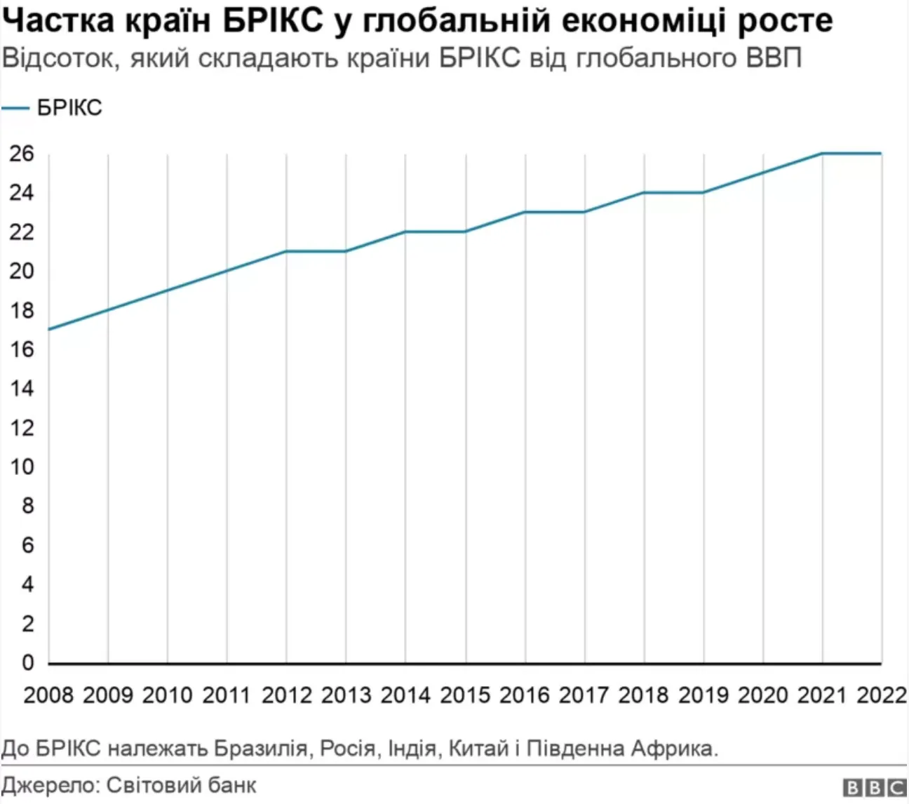 С тех пор очень многое изменилось – экономические чудеса и рост остались в прошлом (по крайней мере для 4 членов из 5), организация так и не стала мощной силой и не получила голоса, с которым стоило бы считаться (это не G7, не G20 и даже на ШОС). Несмотря на то, что доля стран БРИКС в глобальной экономике действительно имела тенденцию к росту, у каждой страны – это индивидуальный процесс.