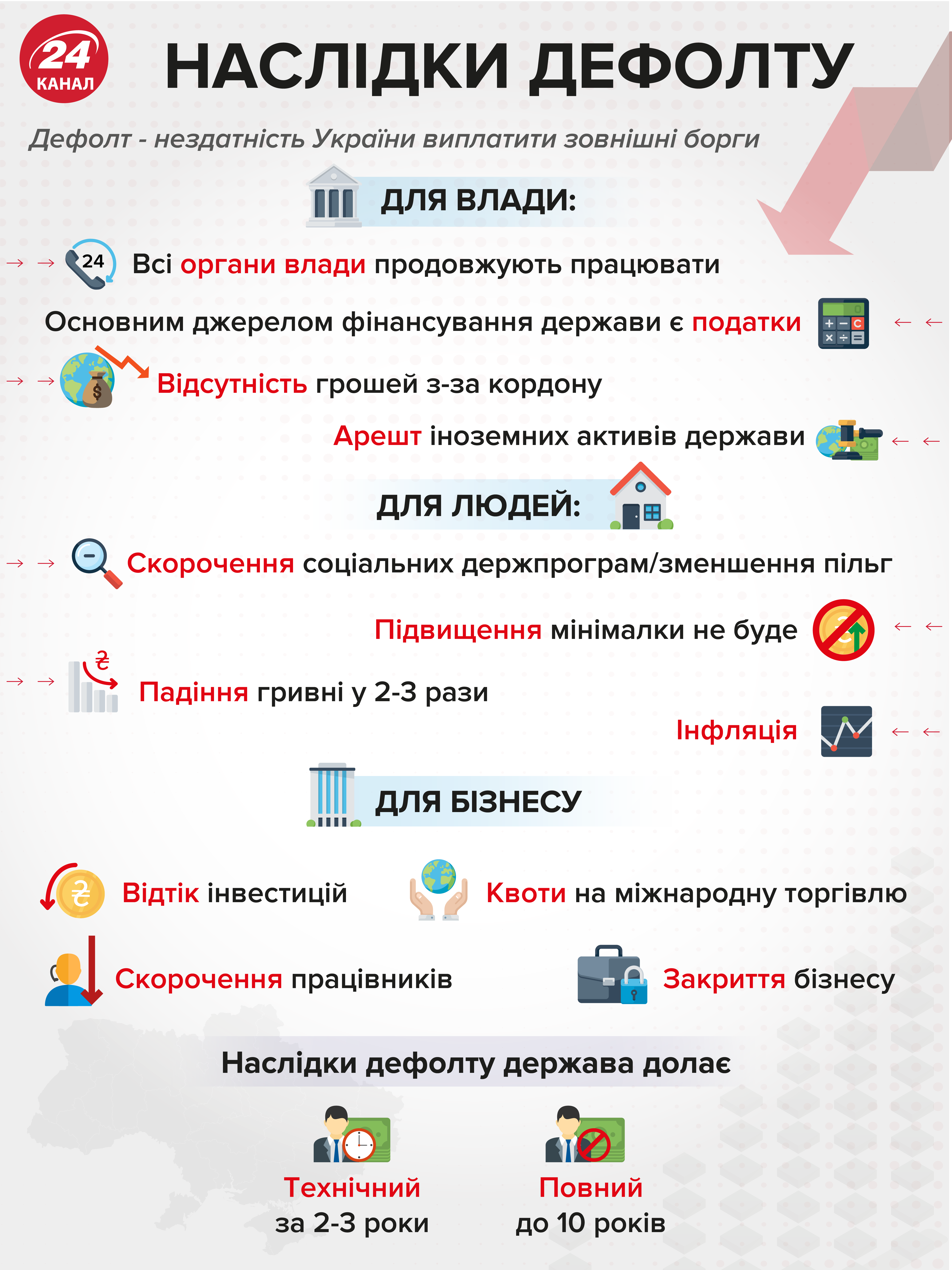 Какими могут быть последствия дефолта, смотрите инфографику: