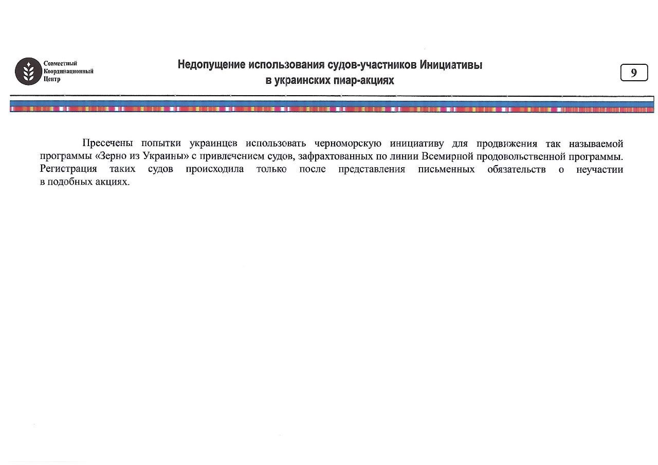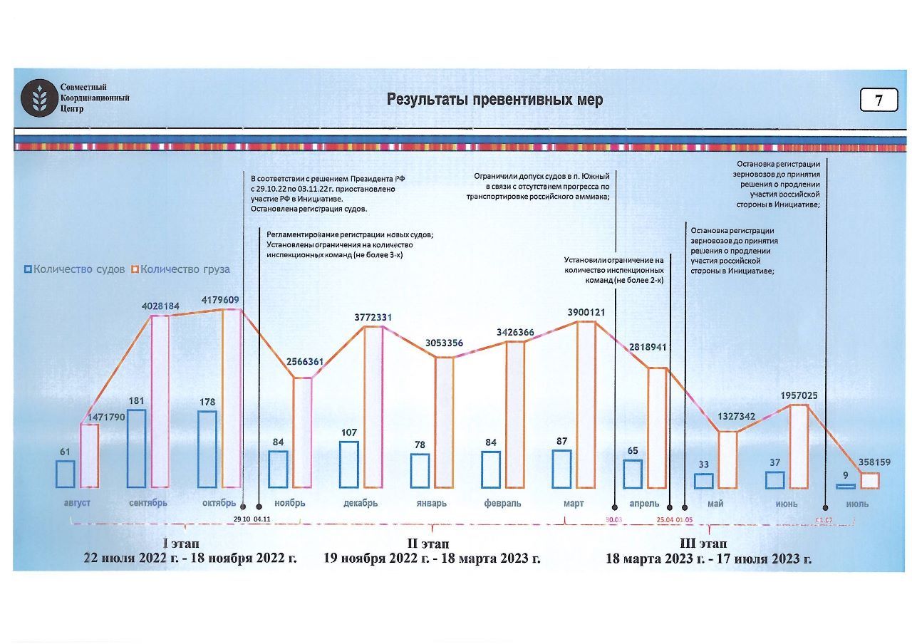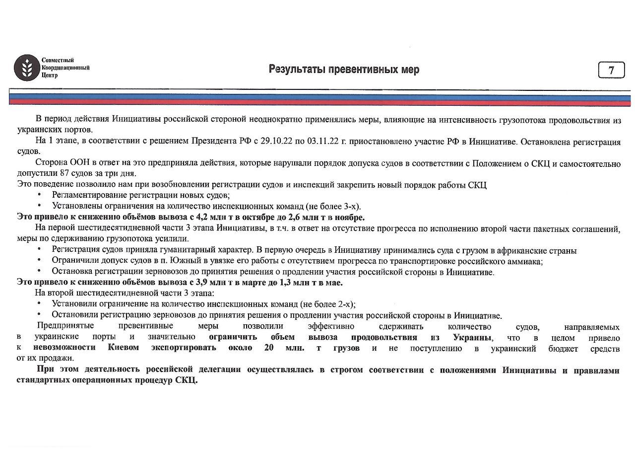 "Качественная проверка судов также была одним из ключевых элементов сдерживания бесконтрольного роста экспорта зерна из украинских портов. При этом деятельность российских инспекторов была построена в строгом соответствии с разработанными методическими документами по организации проведения инспекции судов. По результатам проведенных инспекций будет ограничено участие в инициативе для 46 судов и ограничены в движении 303 судна на общий срок 342 суток", – говорится в документе.