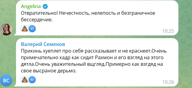 - "Прикиньте, ху*плет о себе рассказывает и не краснеет. Очень примечательный кадр, как сидит Рахмон и его взгляд на этого дятла. Очень почтенный взгляд"