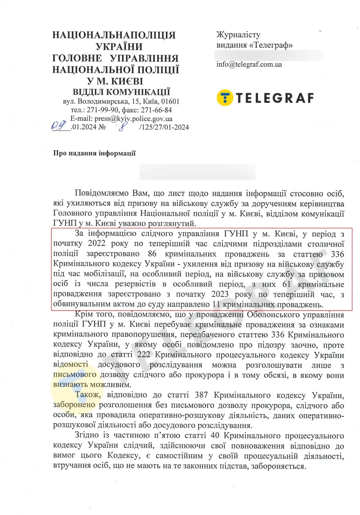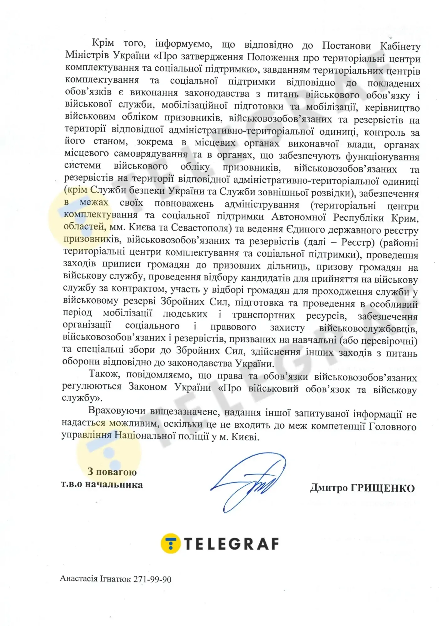 Ответ ГУ НП на запрос журналистов / Фото Telegraf