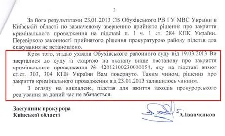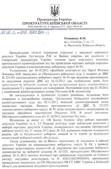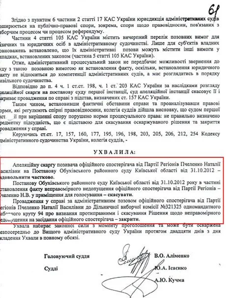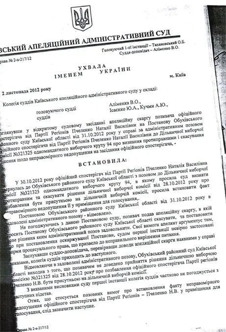 "К моему удивлению, в письме прокуратуры Киевской области от 27 июня 2013 года, полученном мной в конце июля, говорится, что постановлением Киевского апелляционного суда по делу № 2-а-217/12 от 2 ноября 2012 года, иск удовлетворен частично, и признаны противоправными действия участковой избирательной комиссии № 321325 округа № 94, относительно неправомерного недопущения на заседание официального наблюдателя Партии регионов Пчеленко Натальи Васильевны! Просмотрев текст постановления Киевского апелляционного суда по делу № 2-а-217/12 в Едином государственном реестре судебных решений, к моему удивлению, открыл для себя совершенно другой текст постановления, с другой мотивировочной и резолютивной частью! " - добавил он.