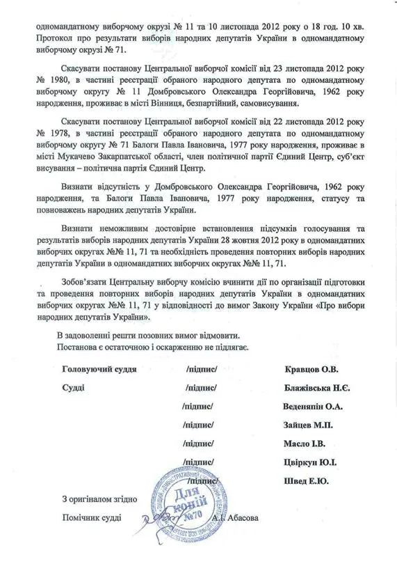 "Признать отсутствие у Домбровского Александра Георгиевича, 1962 года, и Балоги Павла Ивановича, 1977 года рождения, статуса и полномочий народных депутатов Украины", - сказано в документе постановления.