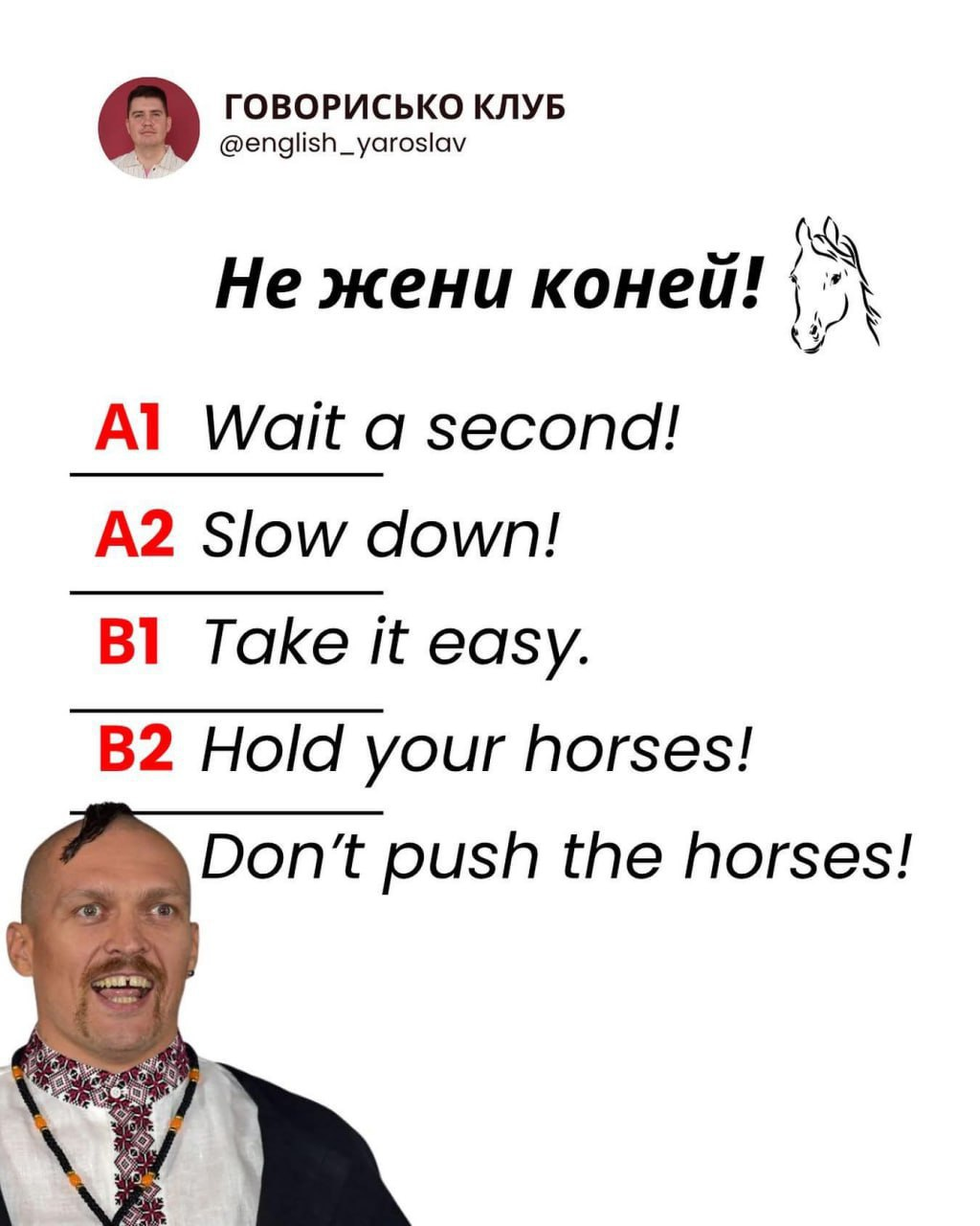 Мемом стала фраза Усика перед боем: "Don't Push The Horses". Это перевод на английский язык фразы "не гоните лошадей". Украинца не совсем поняли иностранцы, потому что в английском языке нет такого выражения.