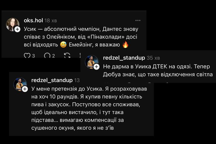 Изрядно удивила украинцев и скорость победы Усика. Зрители шутят, что не успели приготовить себе вкусняшек, как бой уже закончился.