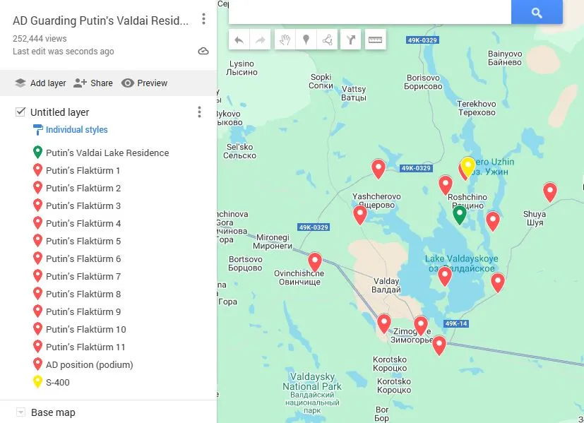 12 башен с "Панцирями" вокруг резиденции Путина – это лишь в 5 раз меньше, чем количество позиций ПВО, которые Радио Свобода с помощью OSINT-энтузиастов обнаружило с 2022 года в Москве и Московской области, население которых составляет более 20 миллионов человек,