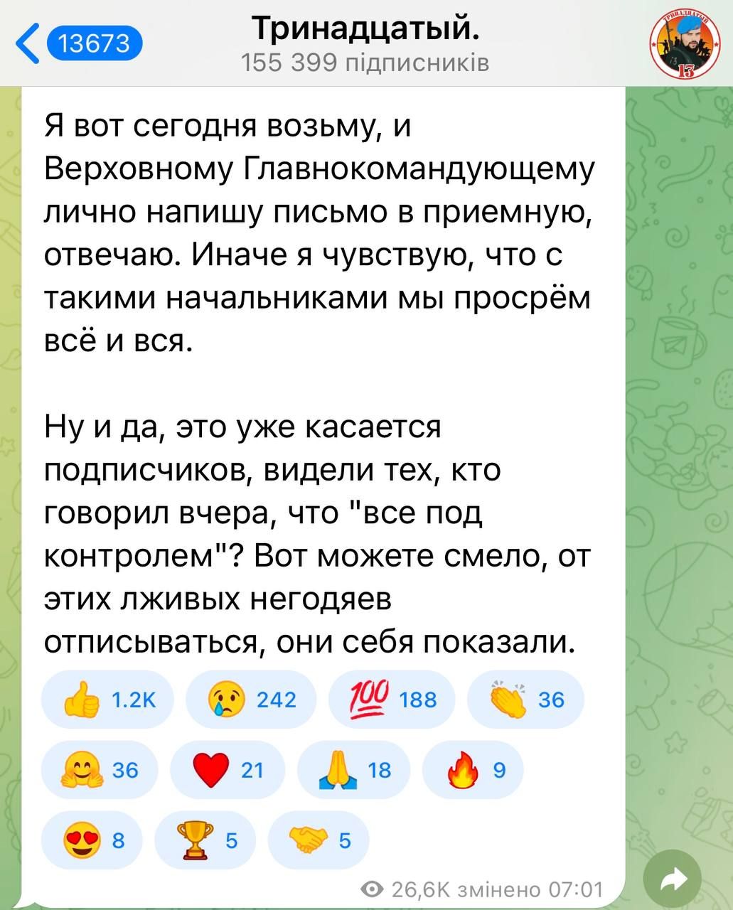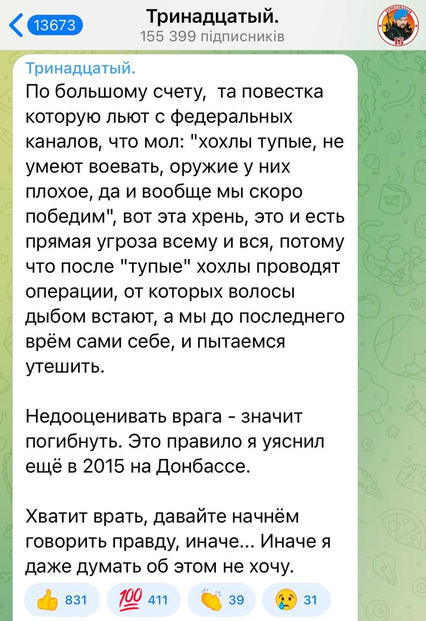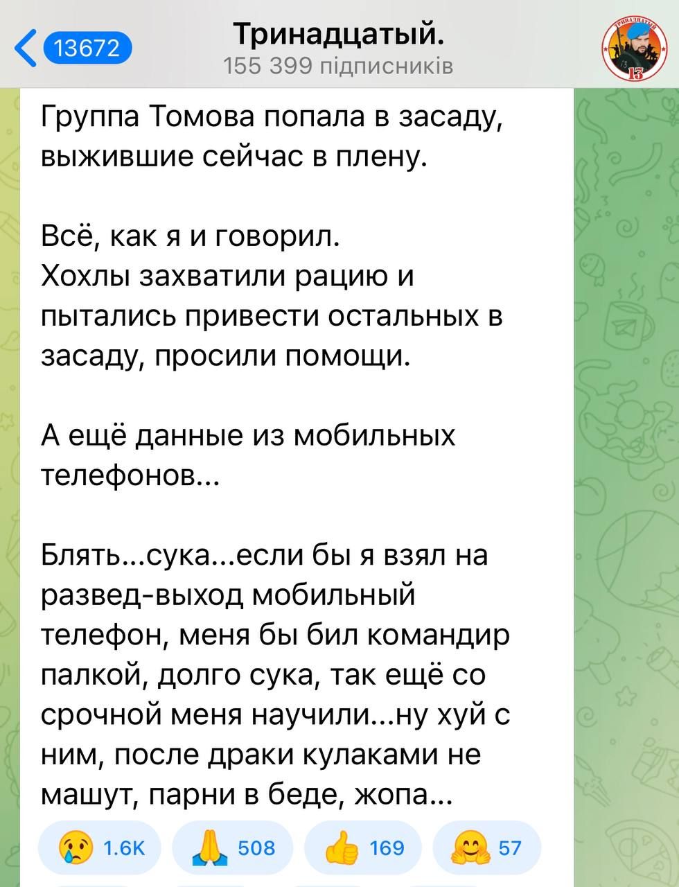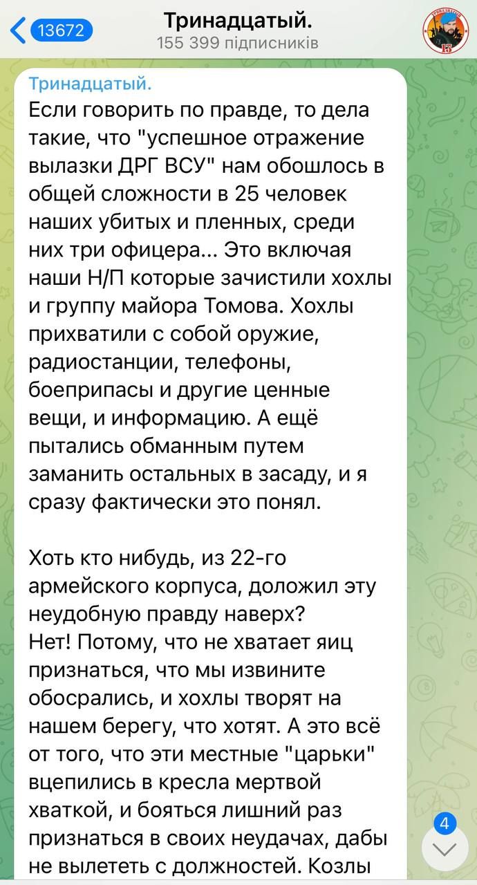 "Если говорить по правде, то дела такие: "успешное отражение вылазки ДРГ ВСУ" нам обошлось в общей сложности в 25 человек наших убитых и пленных, среди них три офицера... Хохлы прихватили с собой оружие, радиостанции, телефоны, боеприпасы и другие ценные вещи и информацию", – сокрушается Гузенко.