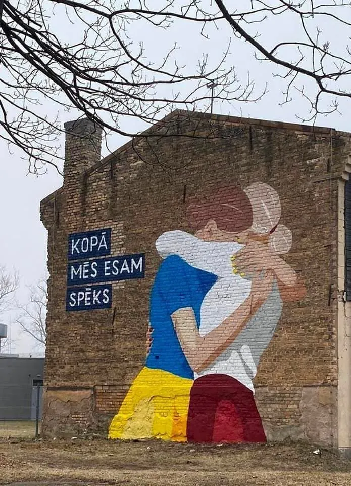 Девушка-Украина впадает в объятия девушки-Латвии. Оба одеты во "флаги" своих стран. Такая стенопись демонстрирует поддержку Украины.