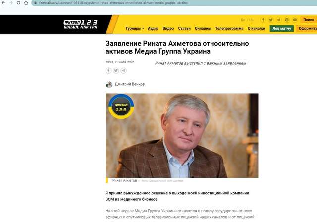 С 12 июля перестали обновляться сайты "Сегодня" и "Украина 24". Не работает и сайт каналов "Футбол 1/2/3". На сайтах размещено сообщение, что Ринат Ахметов объявил о выходе из медиабизнеса.