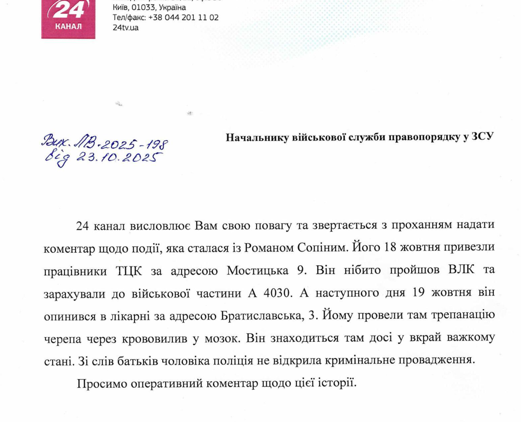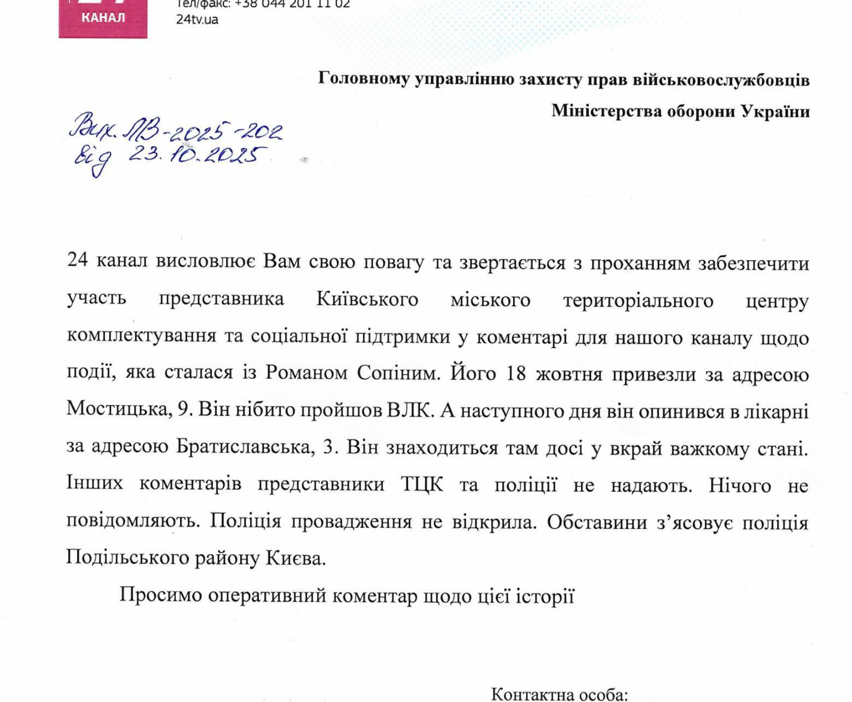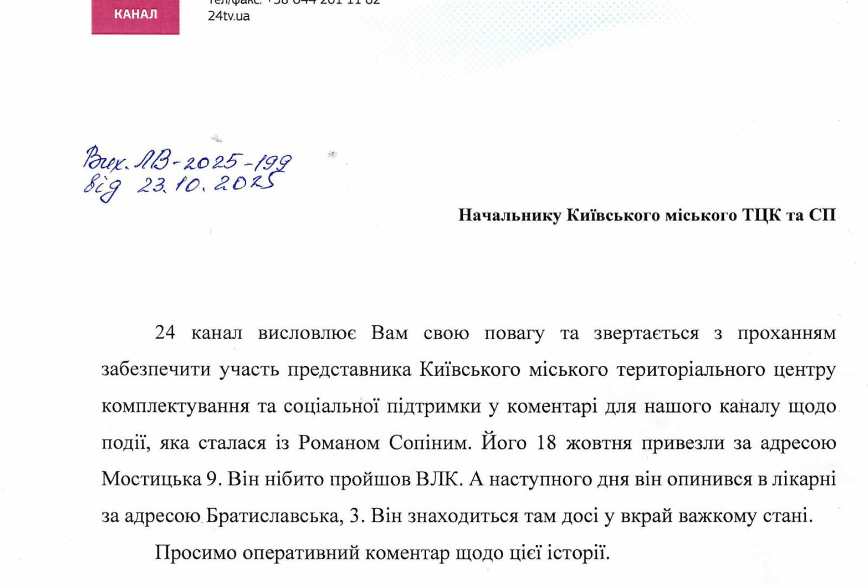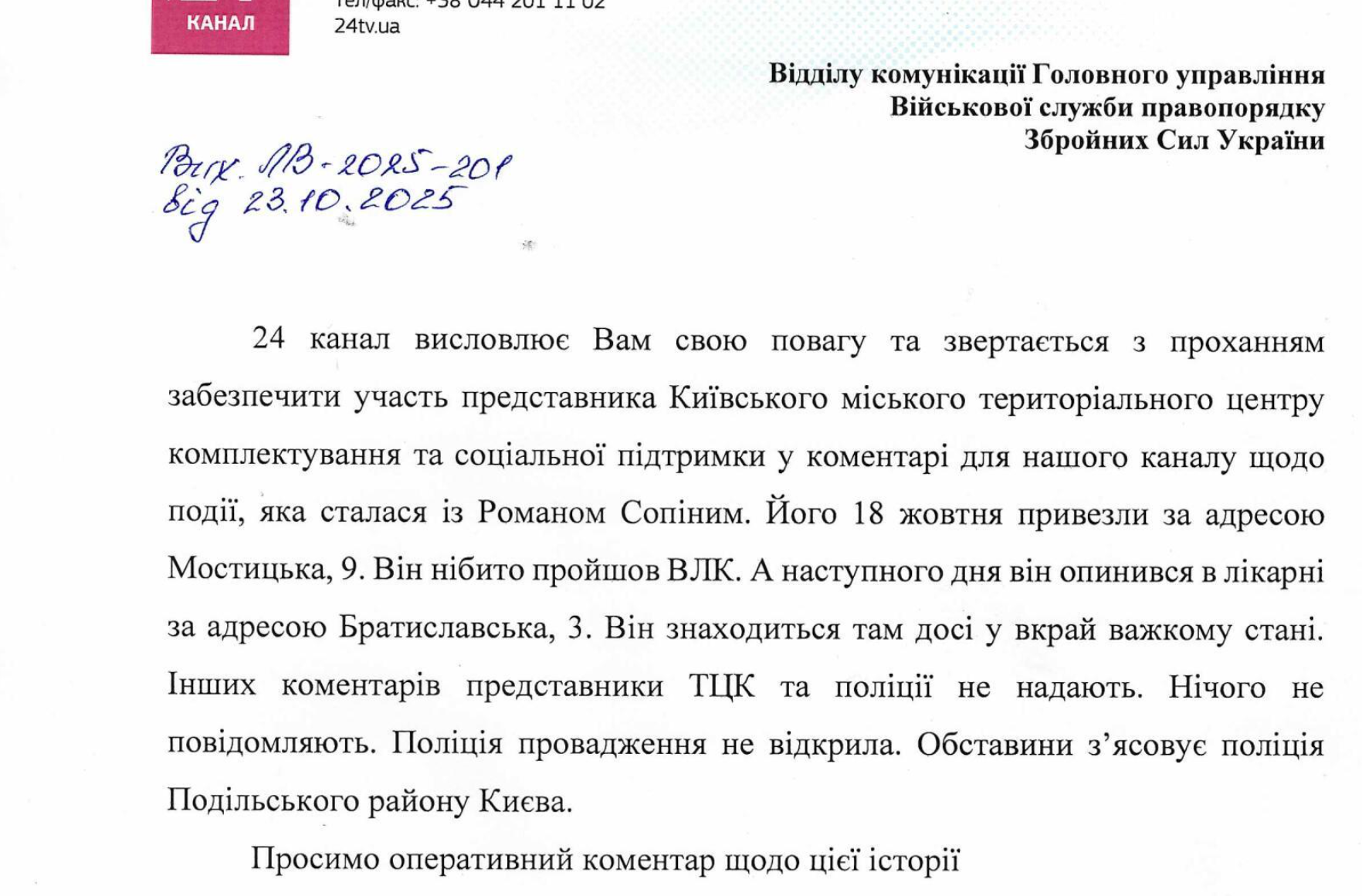 24 Канал подал запросы в Министерство обороны, ВСУ, Киевского городского ТЦК и СП и Военной службы правопорядка для выяснения обстоятельств.