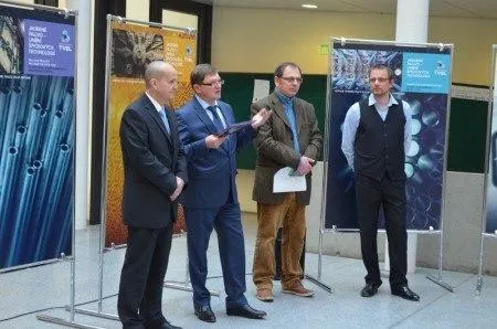 На фото: Виставка "Ядерне паливо як мистецтво" (Прага, 31 березня 2015 року), зліва Антонін Мургаш (Alta), Олександр Уржанов (TVEL), Ондржей Мразэк (перекладач), Радэк Шкода (представник Чеського технічного університету).