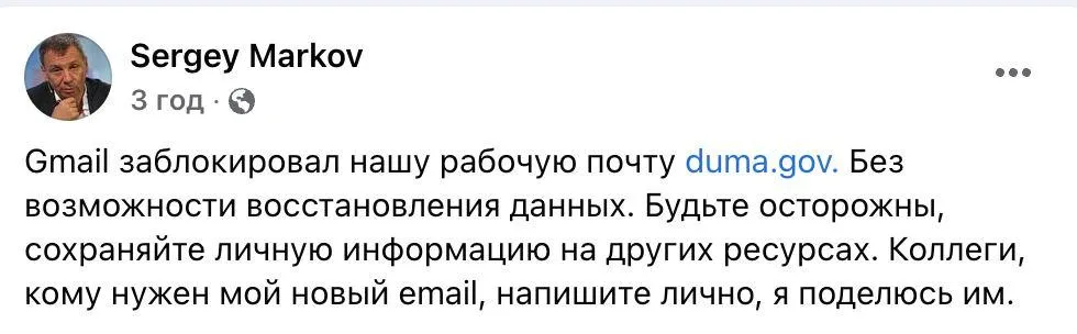 "Gmail заблокировал нашу рабочую почту duma.gov. без возможности обновления данных. Будьте осторожны, храните личную информацию на других ресурсах", – сообщил депутат Сергей Марков.