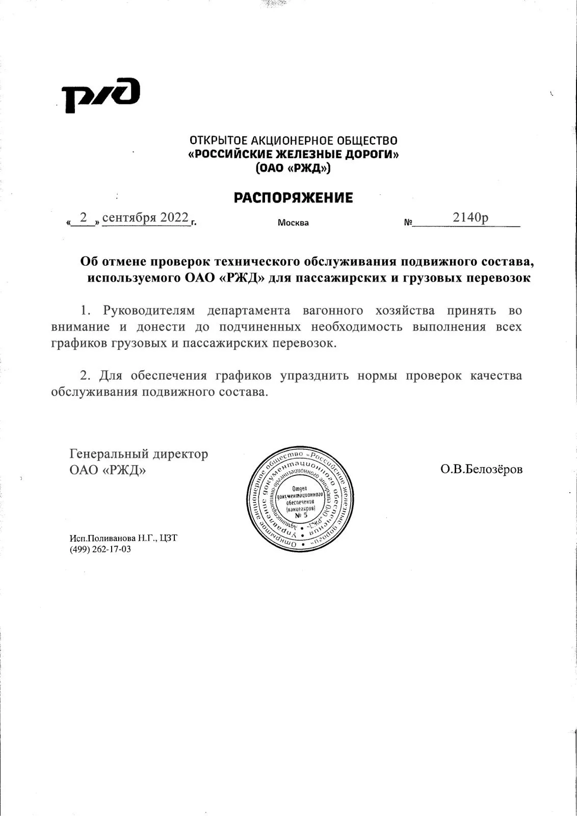 Глава ОАО "РЖД" Олег Белозеров разрешил департаменту вагонного хозяйства вопреки приказу министерства транспорта № 286 от 21 декабря 2010 года "Об утверждении правил технической эксплуатации железных дорог российской федерации" использовать аварийные вагоны.